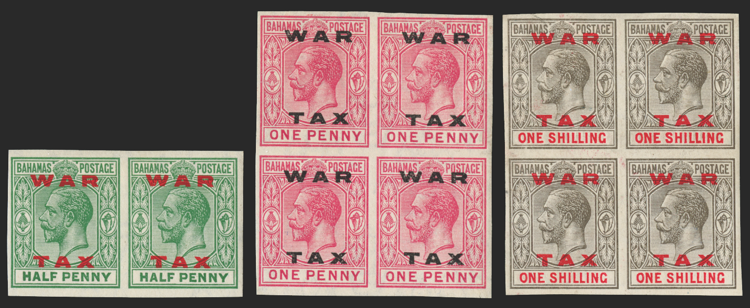 Bahamas 1919 (14 July) 'WAR TAX' (type 14 overprint by De La Rue) ½d green, 1d carmine and 1s grey-black and carmine, IMPERFORATE PROOFS on gummed watermarked paper, SG102/4.