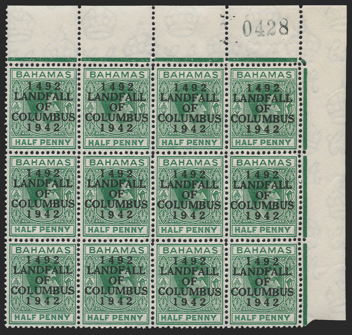 Bahamas 1942 'Columbus' ½d bluish green, upper right corner block of 12 (4x3) showing sheet number '0428', third stamp of top row (R1/5) showing 'Accent' flaw, SG162c.