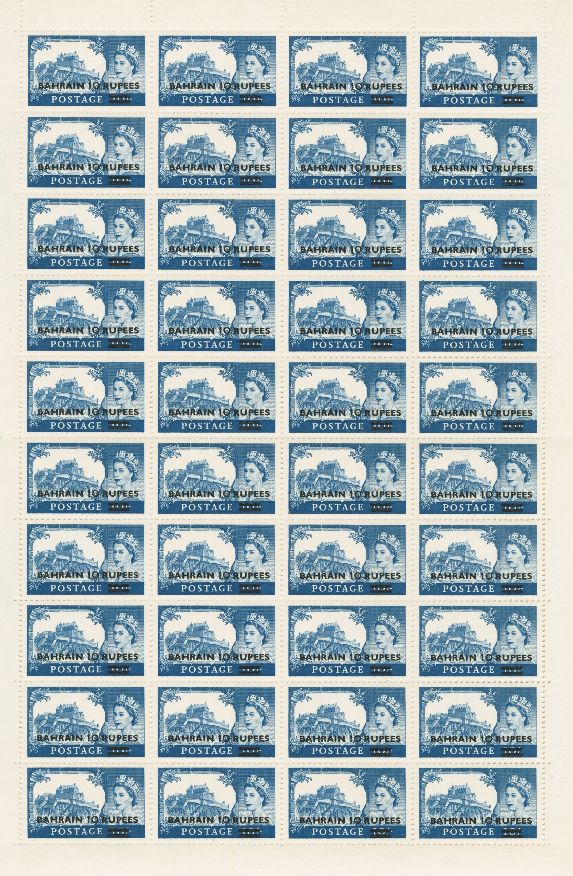 Bahrain 1955-60 10r on 10s ultramarine, De La Rue printing, type II surcharge, complete folded sheet of 40 (4x10), left pane with guide-mark in left margin, SG96ab.