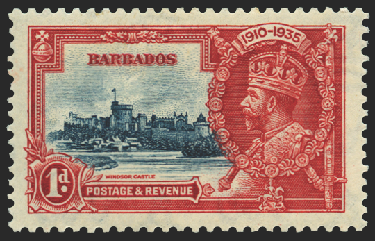 Barbados 1935 Silver Jubilee 1d deep blue and scarlet, from vignette plate "1" showing variety "Damaged turret" (R5/6), SG241j.