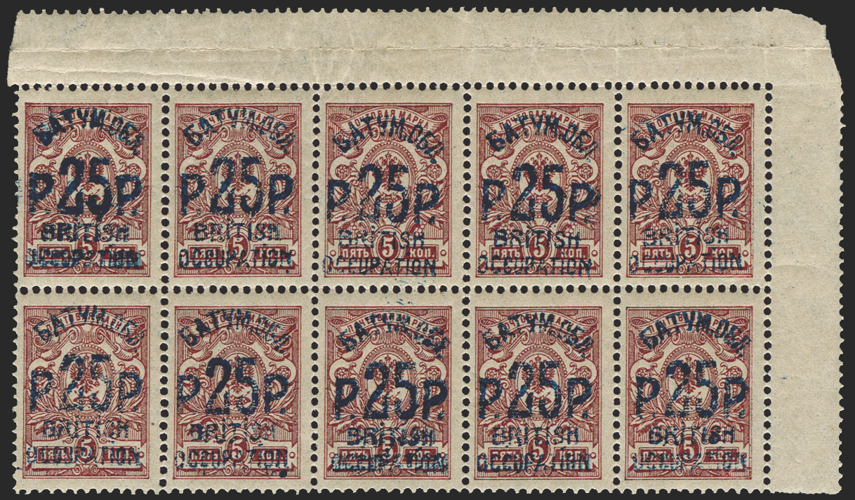 Batum British Occupation 1920 (21 Feb) 25r on 5k brown-lilac, surcharge as type 6 in blue, BLOCK OF TEN (5x2) from upper right corner of a pane, SG29a.