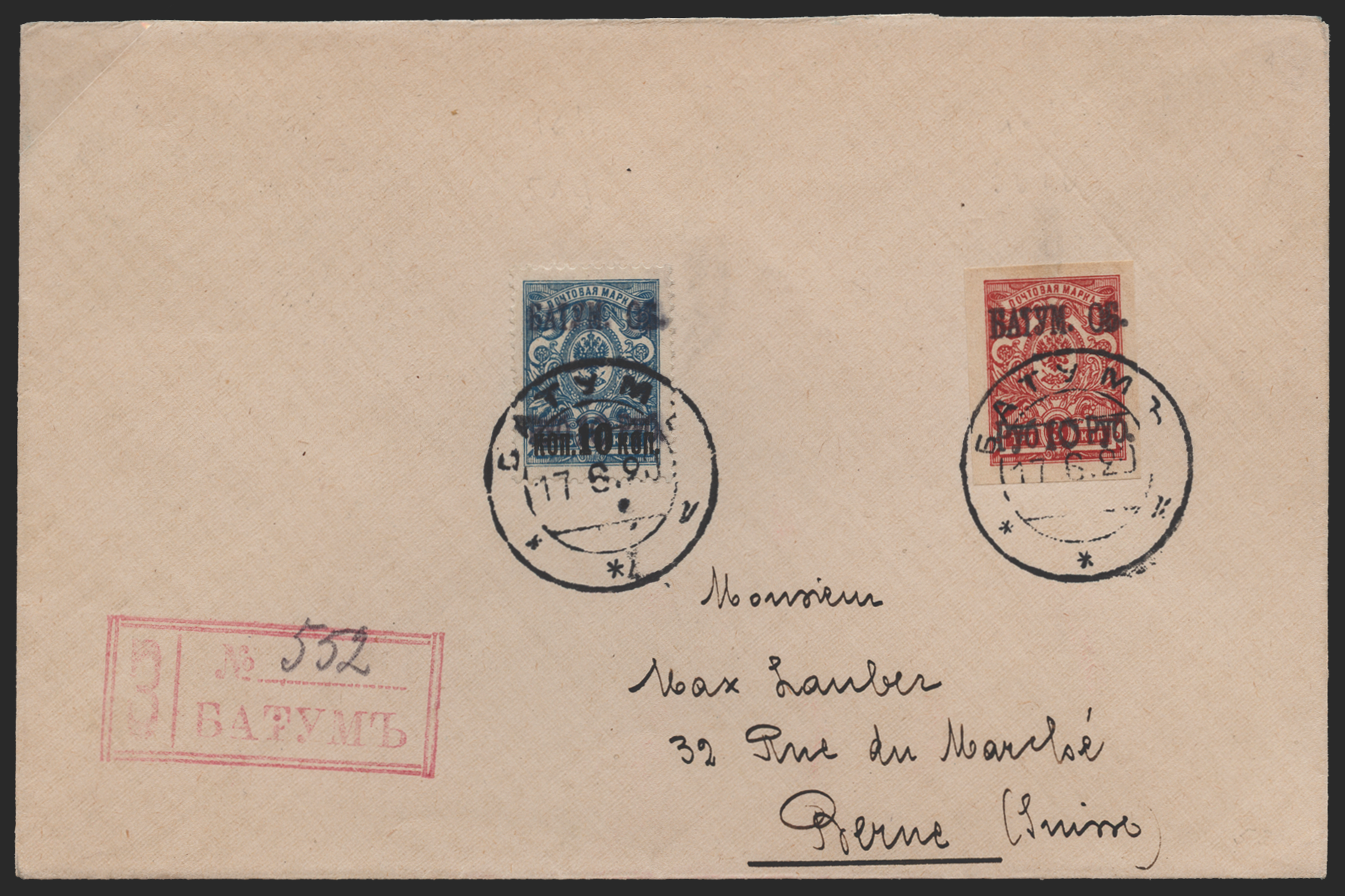 Batum British Occupation 1920 (17 June) registered "Lauber" cover to Switzerland, franked by 1919 (13 Apr) 10r on 3k carmine-red and 10r on 10 on 7k deep blue with type 2 surcharges, tied by individual strikes of "17 6.20" circular date stamps, with red registration cachet at lower left and Bern arrival backstamp (14 VII 20).
