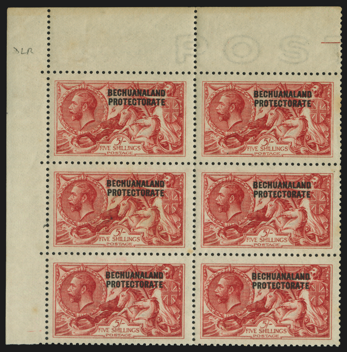 Bechuanaland 1913-24 5s bright carmine, "King George V Seahorses" SG87, De La Rue printing, upper left corner block of 6 (2x3).