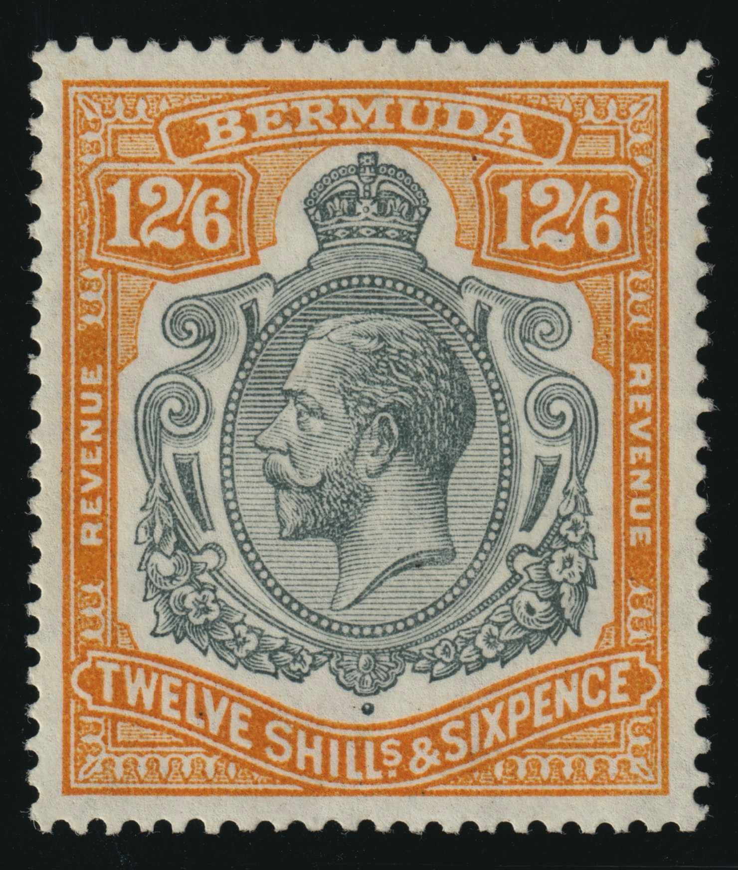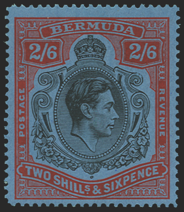 Bermuda 1938-53 2s6d black and red/grey-blue, perforations 14¼ line from May 1941 printing, variety 'Broken top right scroll' (R5/11), SG117ad.