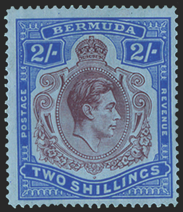 Bermuda 1938-53 2s deep purple and ultramarine/grey-blue, SG116bc, perforations 14¼ (line) from May 1941 printing (200 sheets), showing the prominent and important variety 'lower right scroll with broken tail' (R2/10).