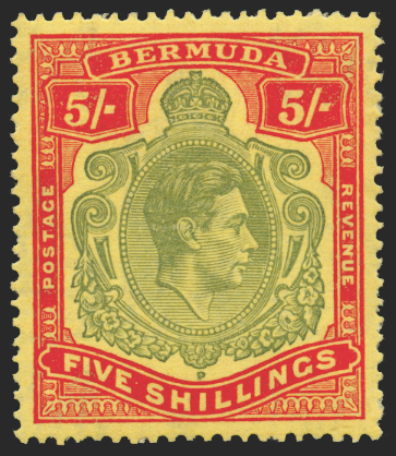 Bermuda 1938-53 5s bronze-green and carmine-red/pale yellow, ordinary paper, perforations 14, SG118c.