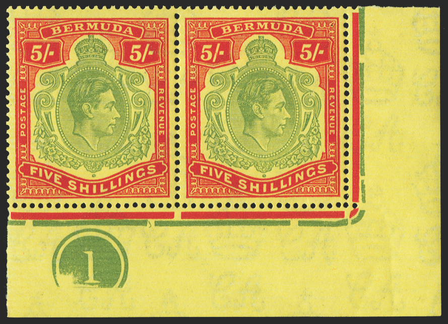 Bermuda 1938-53 5s pale bluish green and carmine-red/pale yellow, lower right corner horizontal pair with plate number '1'. The right stamp (R5/12) shows variety 'Broken lower right scroll', SG118d/de.