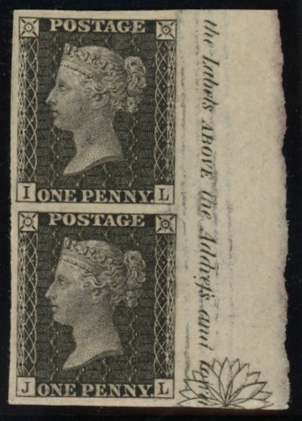 Magnificent right hand marginal four margin unused with original gum vertical pair lettered 'IL-JL'. With full deckle edge selvedge showing inscription and central sheet ornament.