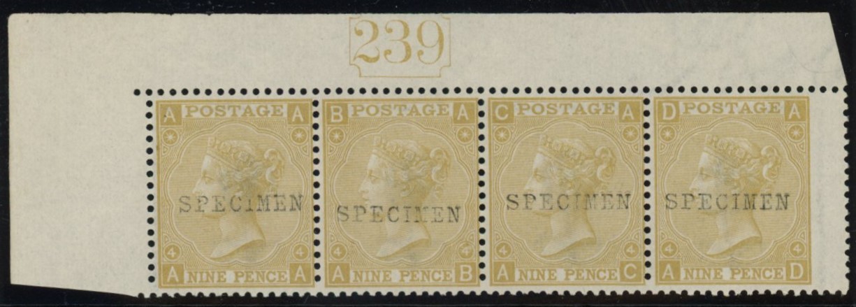 Great Britain 1867 9d straw PIate 4 Specimens, SG110s.