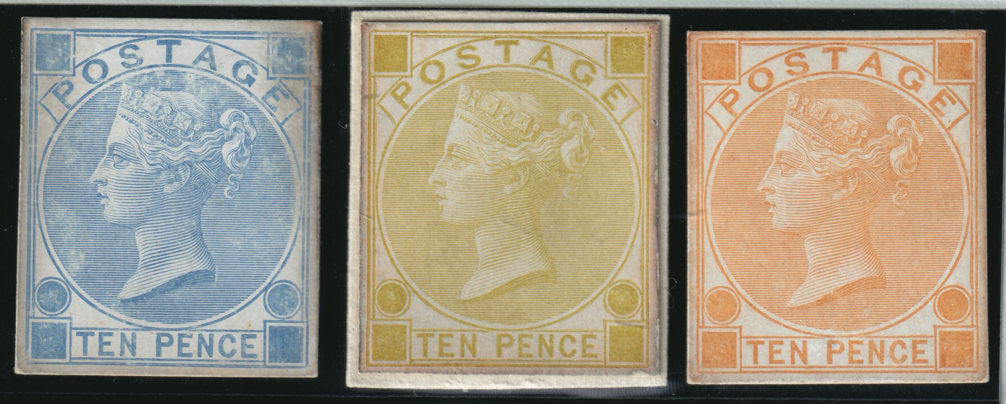 Very fine cut to stamp size examples printed in dull pale blue, olive green and orange without corner letters or plate numbers, produced by De La Rue for the 1867 Paris Exhibition.