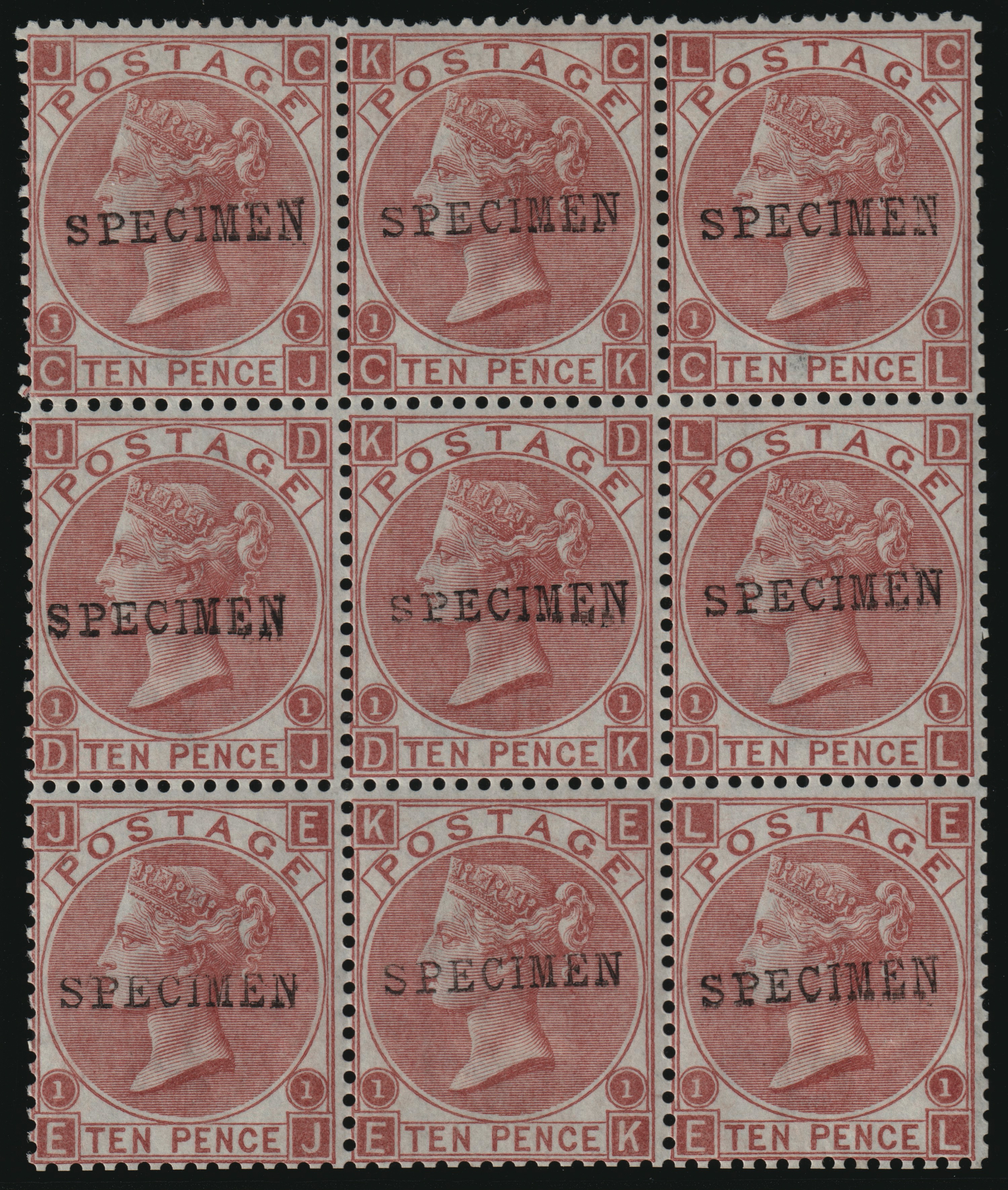 A superb unused with original gum block of nine lettered 'CJ-EL', overprinted "SPECIMEN" type 9. A few split perforations between 'CJ-DJ' and a shortish perforation on 'CL', nevertheless a very scarce and attractive multiple.