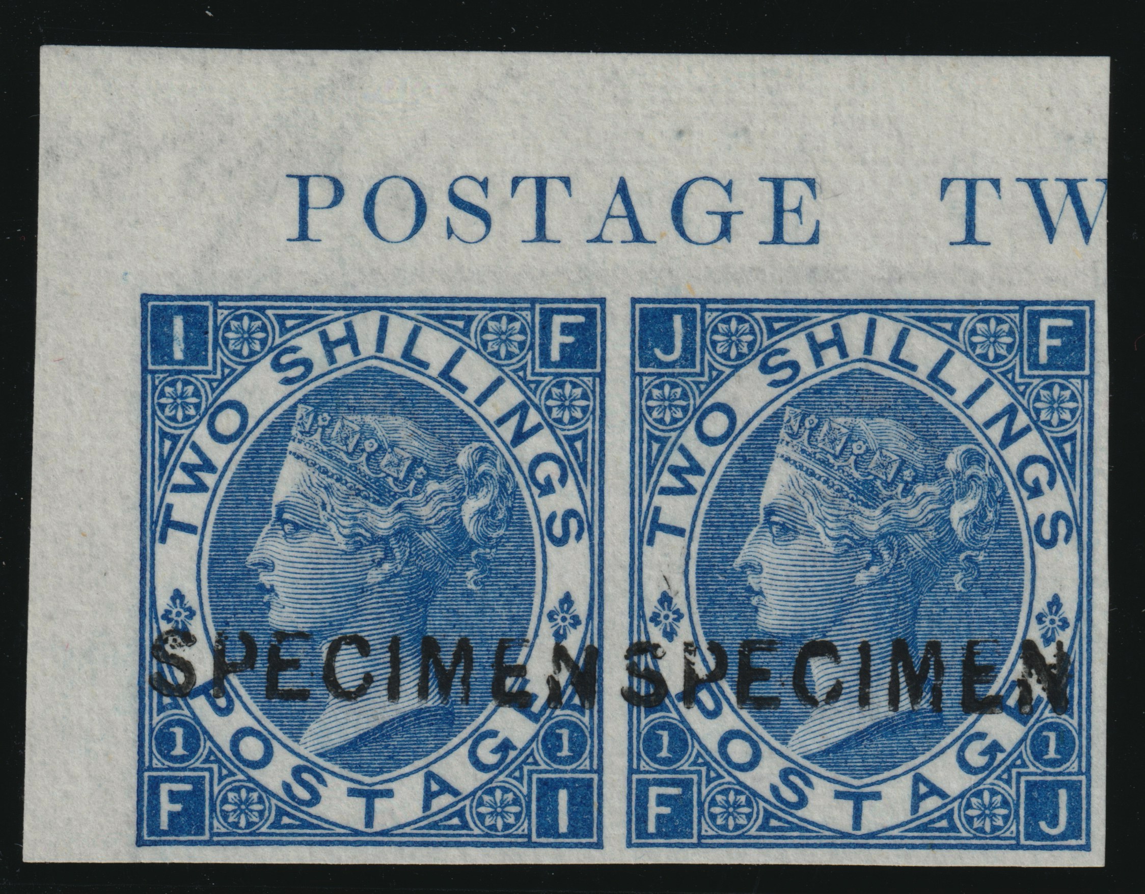 A superb unused imperforate top marginal pair lettered FI-FJ, overprinted "SPECIMEN" type 6 showing part sheet inscription "Postage TW".