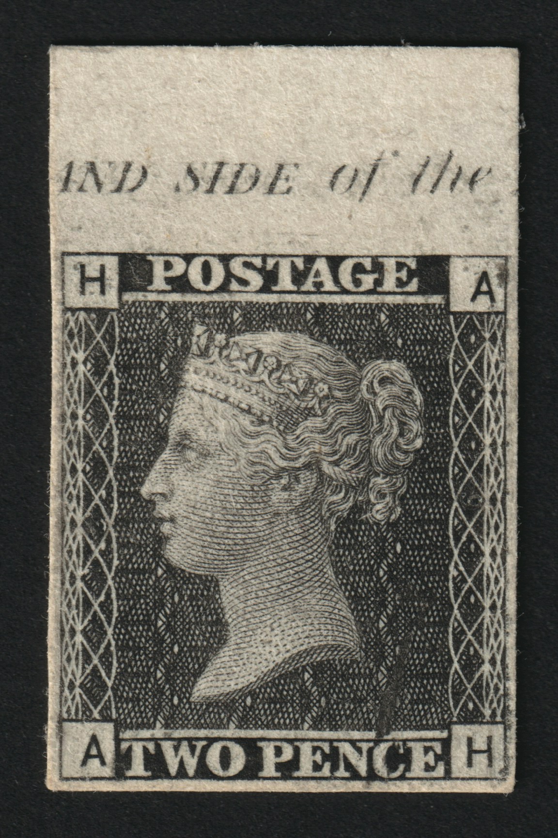 A very fine unused imperforate top marginal example printed on thick white card lettered 'AH', showing part sheet inscription.