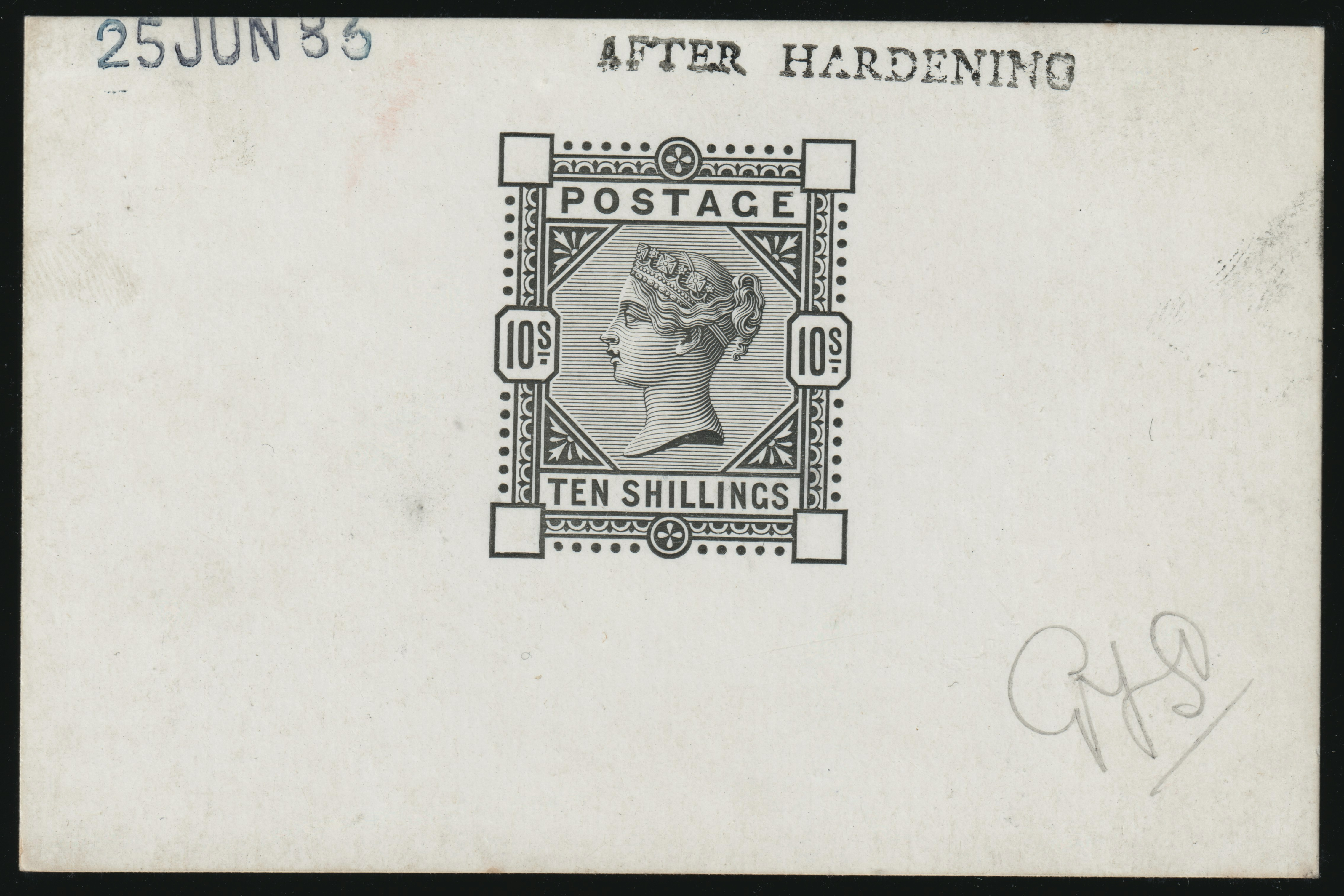 A very fine example without corner letters, printed in black on white glazed card (61 x 92mm) endorsed "AFTER HARDENING", dated "25 JUN 83" and initialled "GFS" at bottom right.