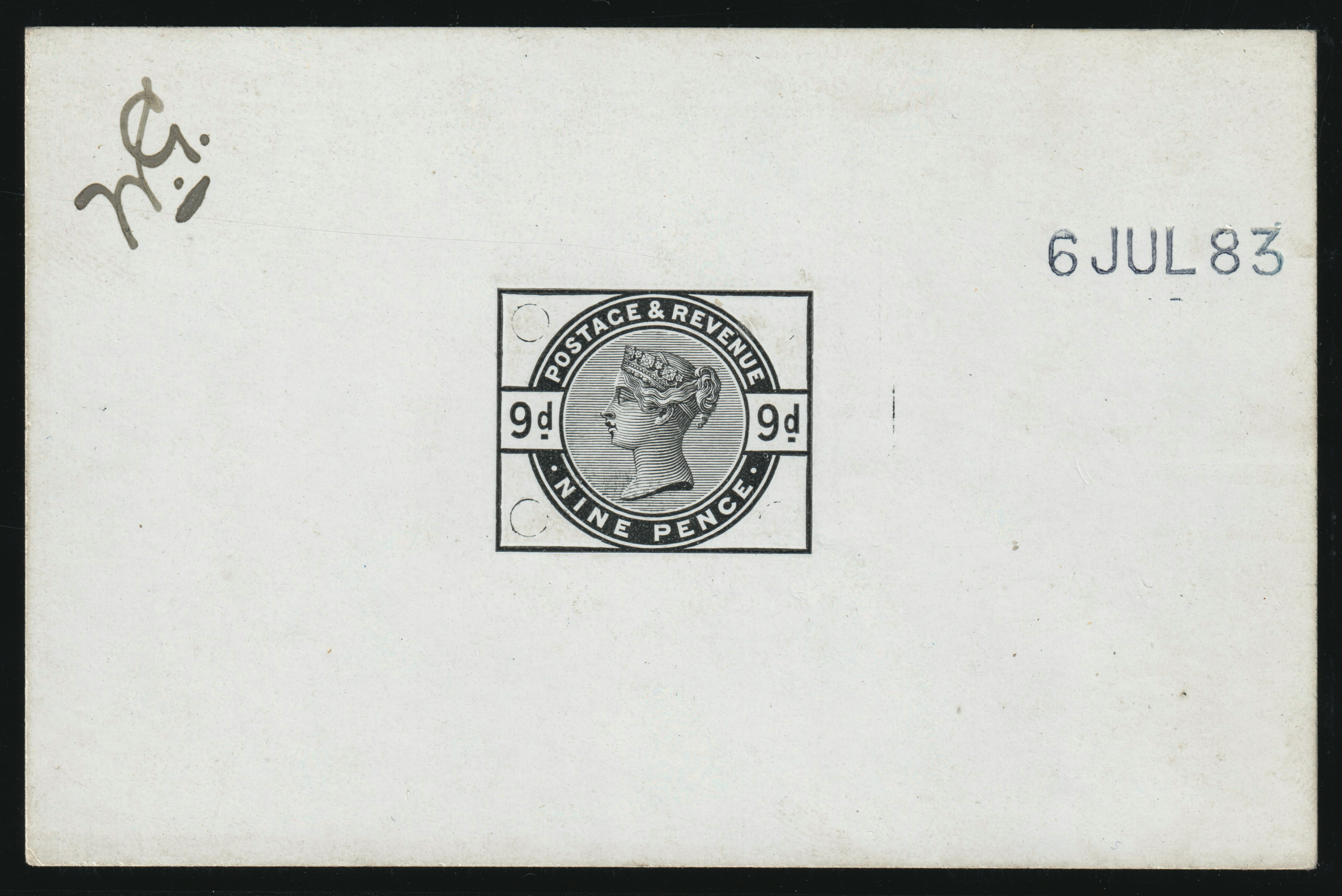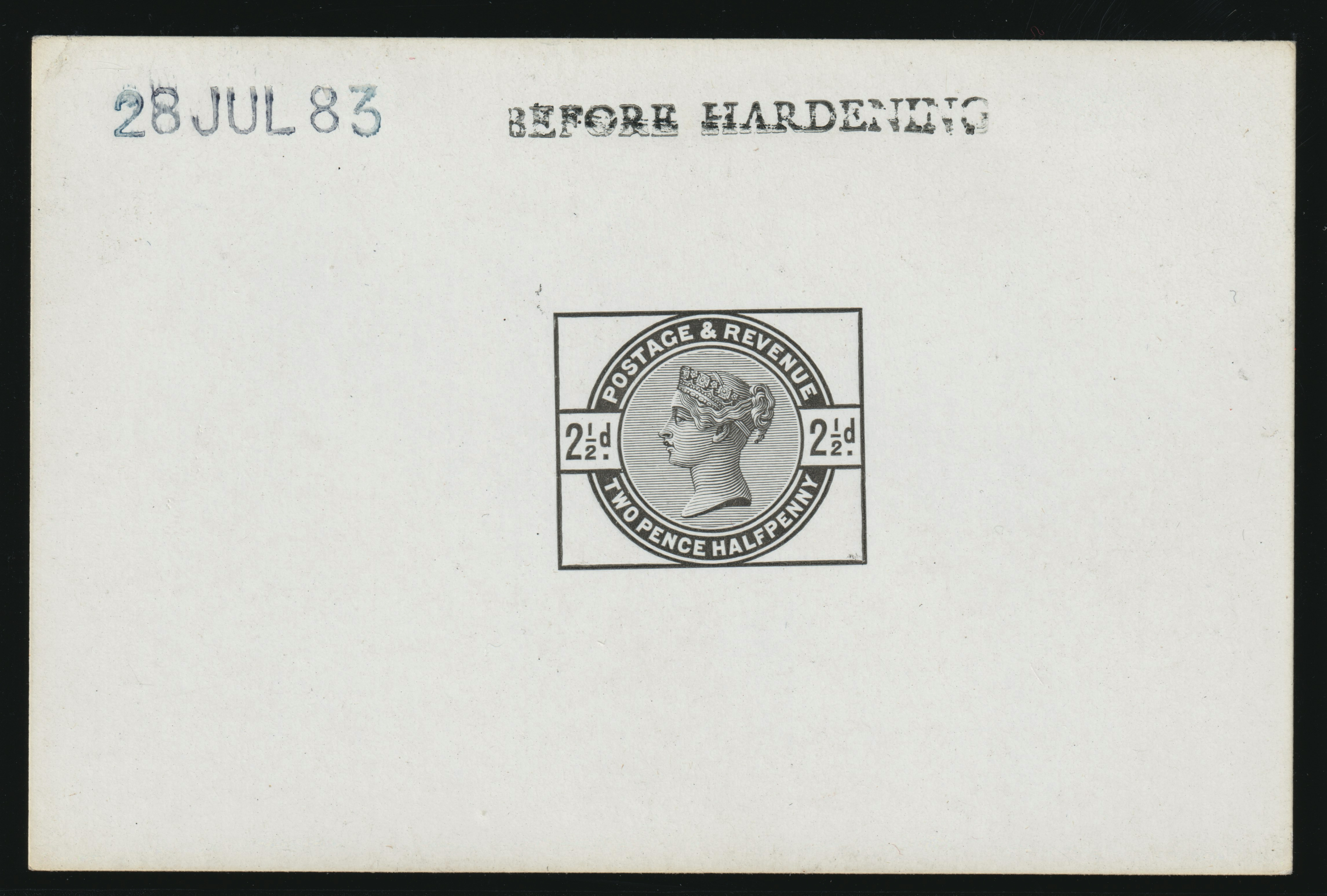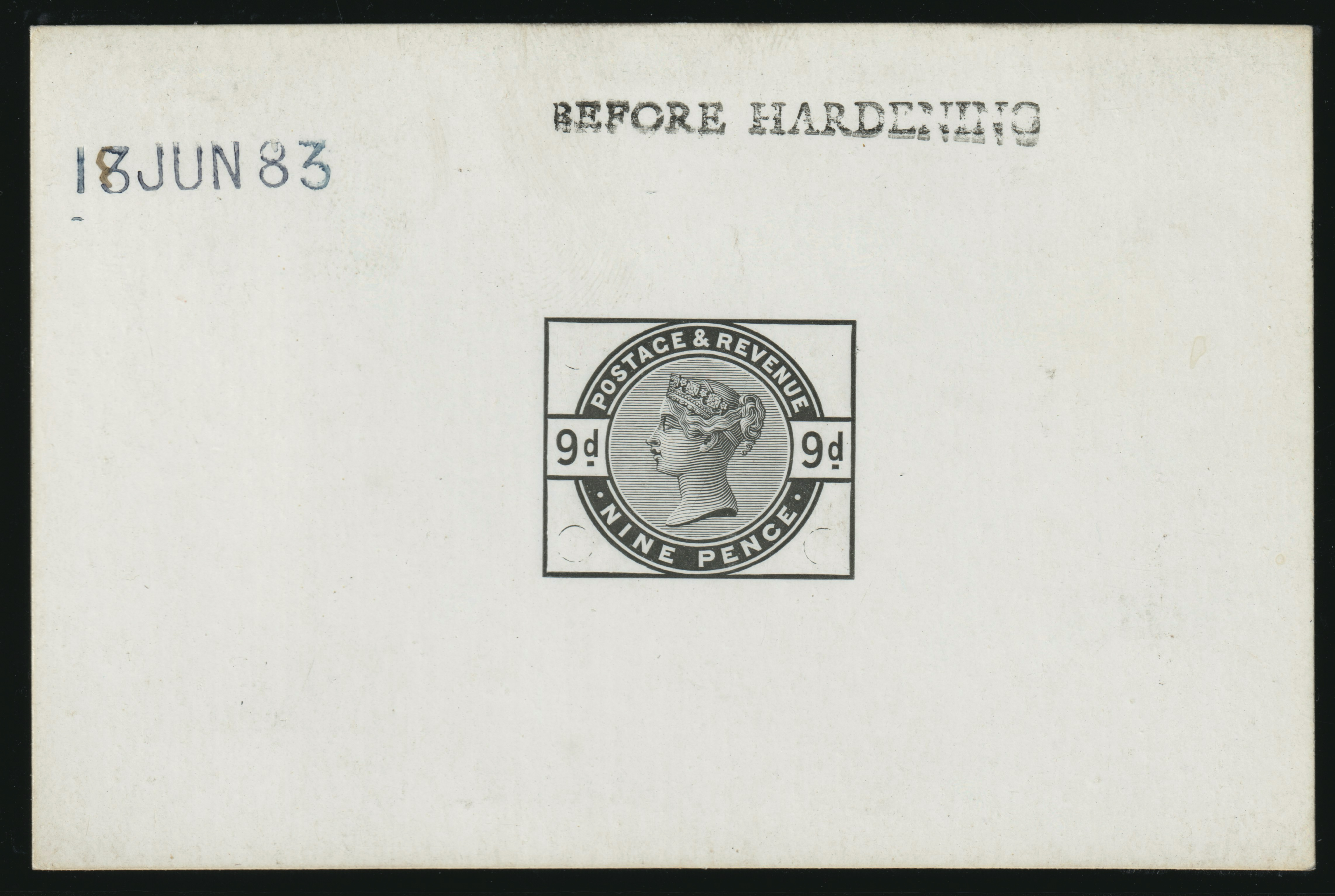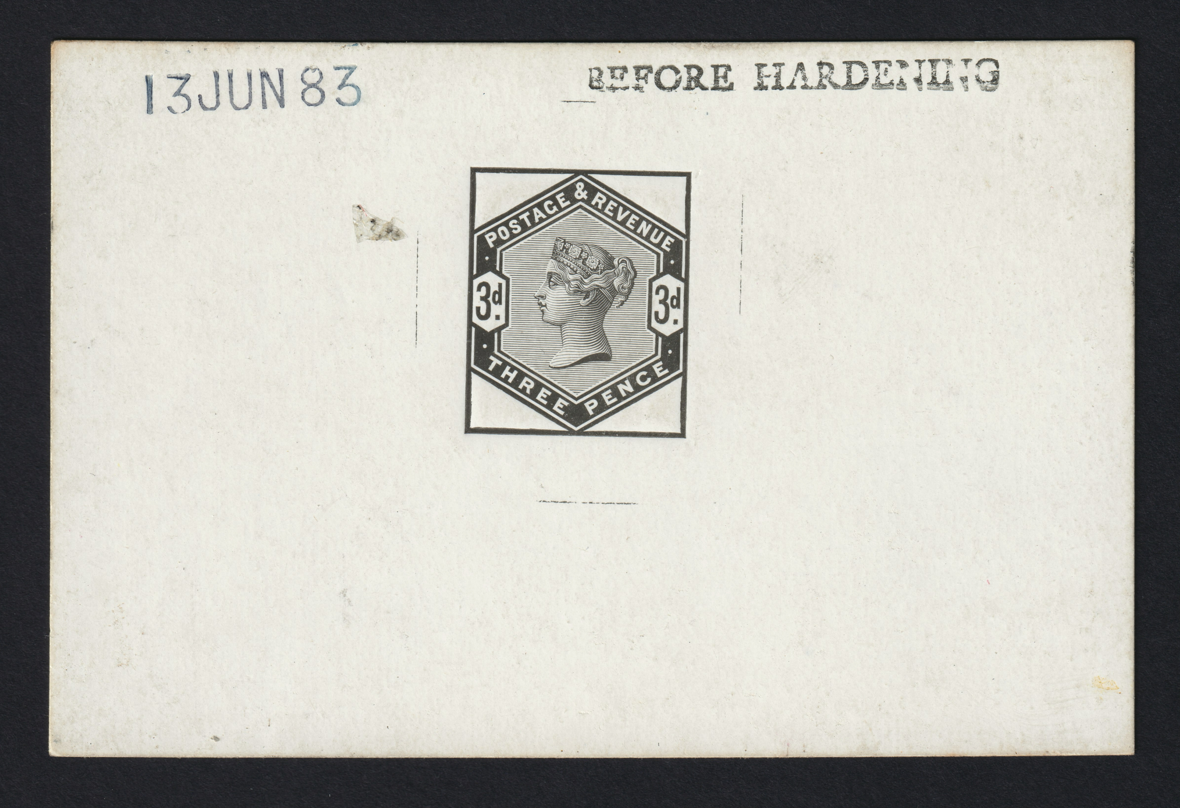 A very fine example printed by De La Rue in black on white glazed card (92 x 60mm) with circles in three letter corners, endorsed "BEFORE HARDENING" and dated "13 JUN 83" but altered to "18 JUN 83" with manuscript.