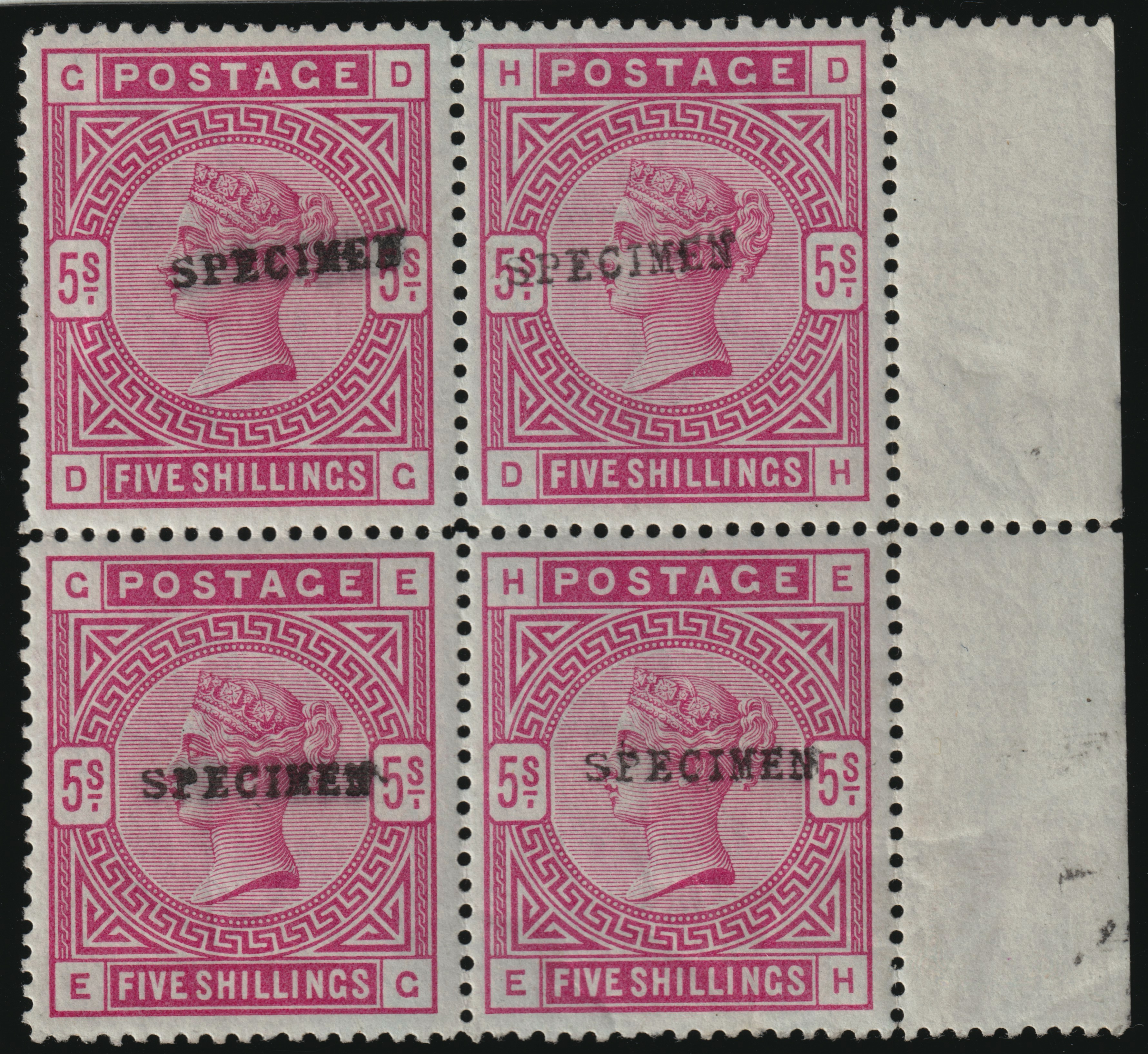 A very fine unused with original gum right hand marginal block of four (lower pair unmounted mint) lettered 'DG-EH', each stamp overprinted "SPECIMEN" type 9.