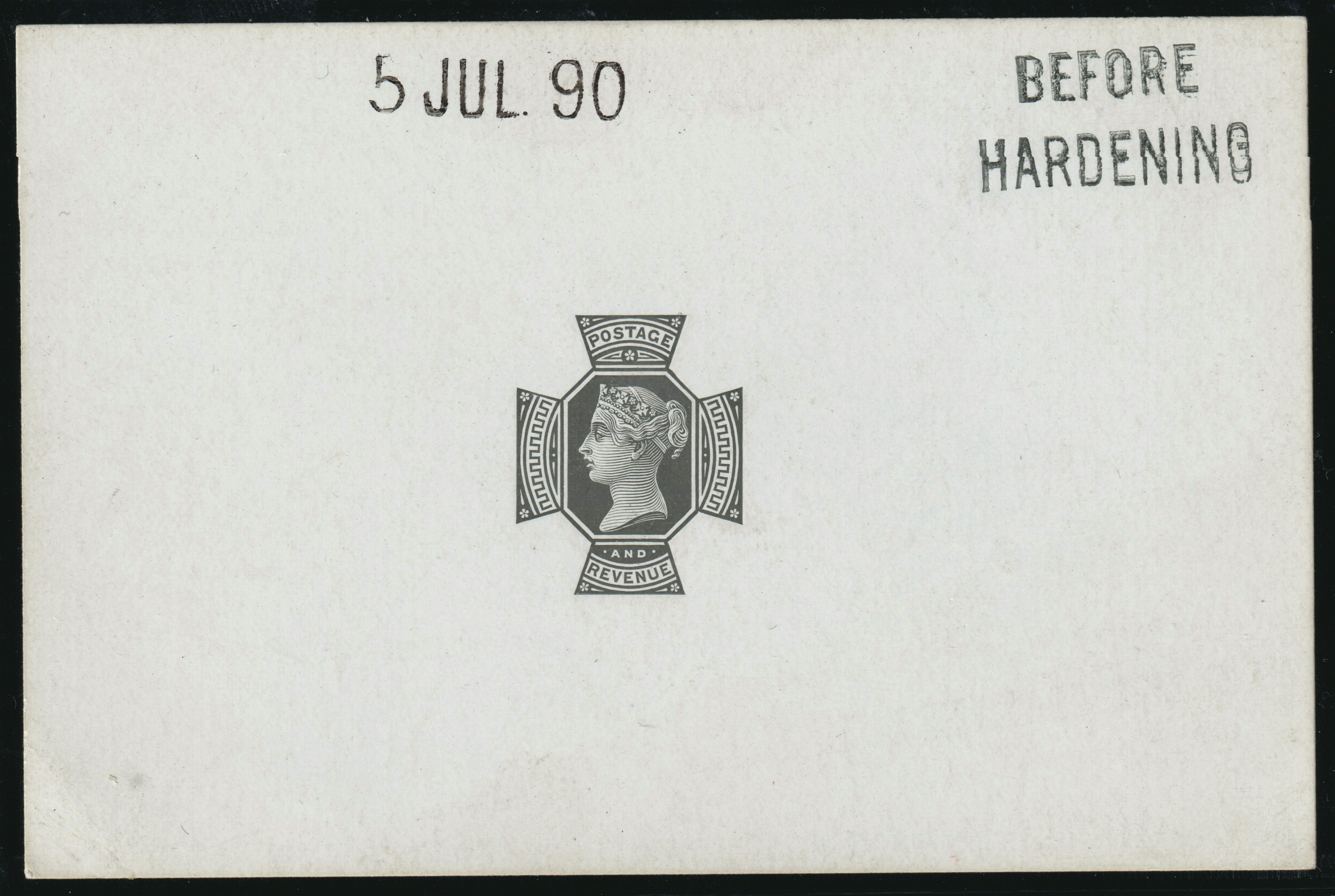 A very fine head plate proof from head die “311" showing a larger pendant curl than die "288", printed in black on white glazed card (92 x 60mm) endorsed "BEFORE HARDENING" and dated "5 JUL 1890".