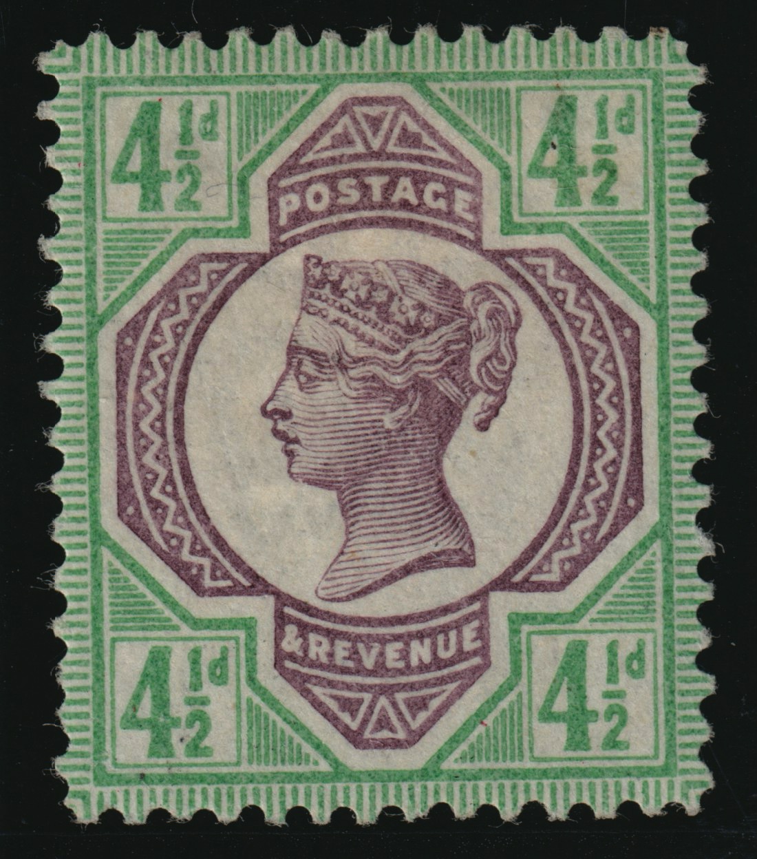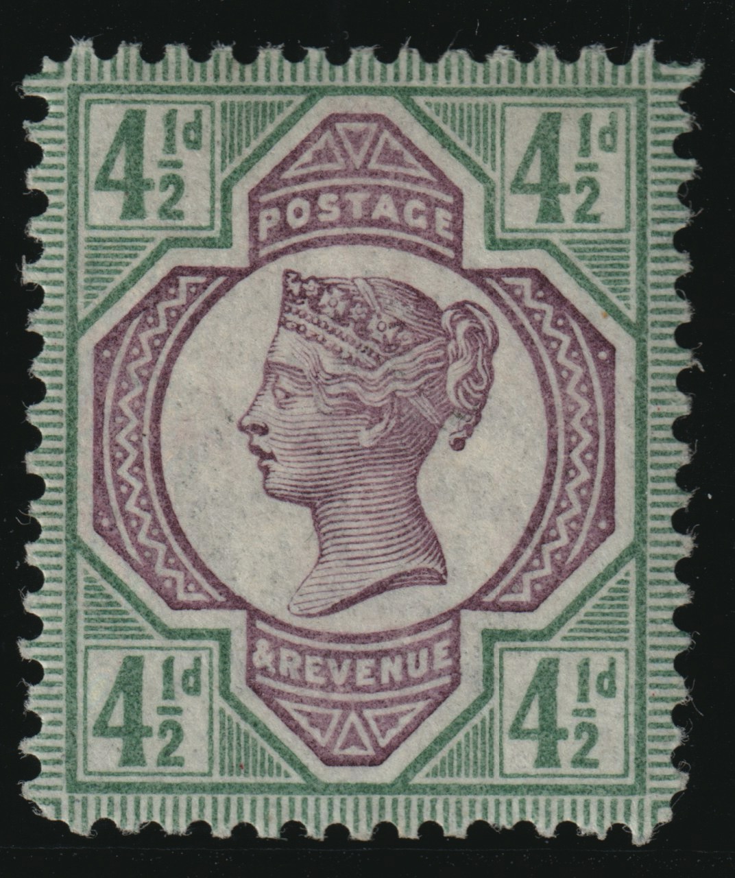 A very fine perforated example printed in mauve and green on gummed Crown watermarked paper.