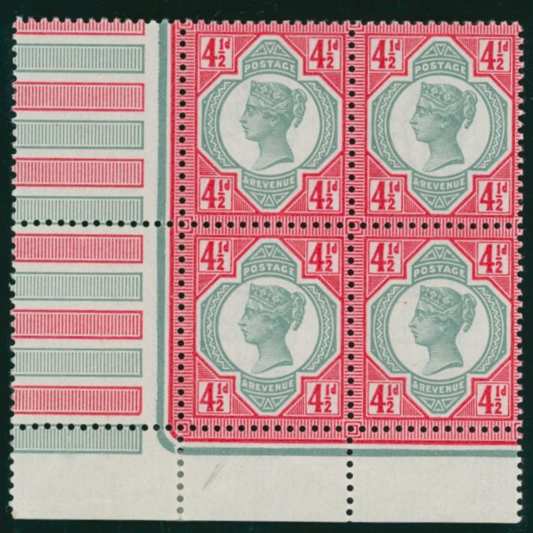 A very fine unmounted mint, with full original gum, bottom left hand corner marginal block of four, well centred with superb colour.