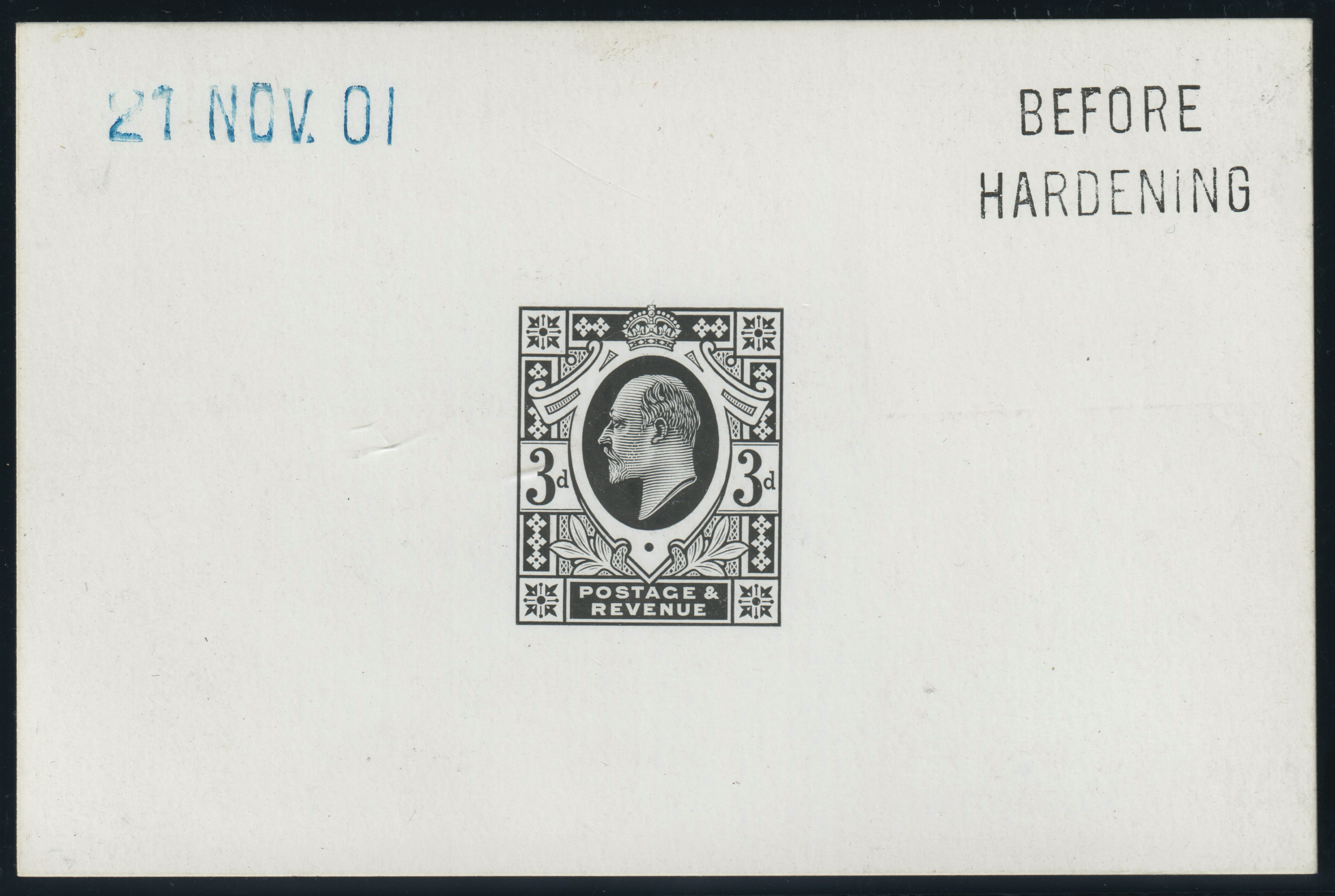 A very fine example printed in black on white glazed card (92x 60mm), dated "21 NOV 01" and endorsed "BEFORE HARDENING".