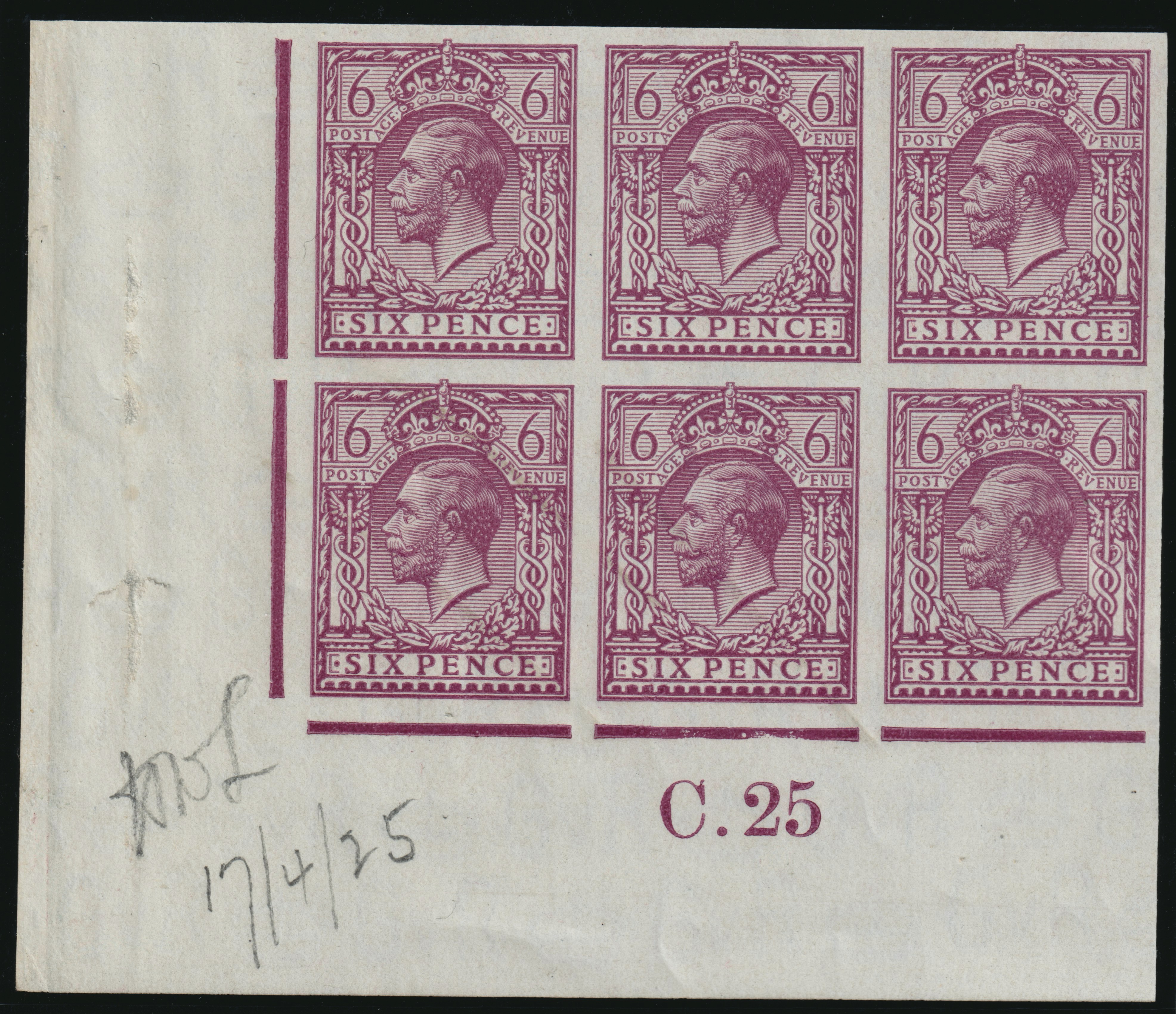 A very fine unmounted mint, with full original gum, imperforate left hand corner marginal "C.25" control block of six imprimaturs with “BPMA†handstamps on reverse, dated "17/4/25" in margin.
