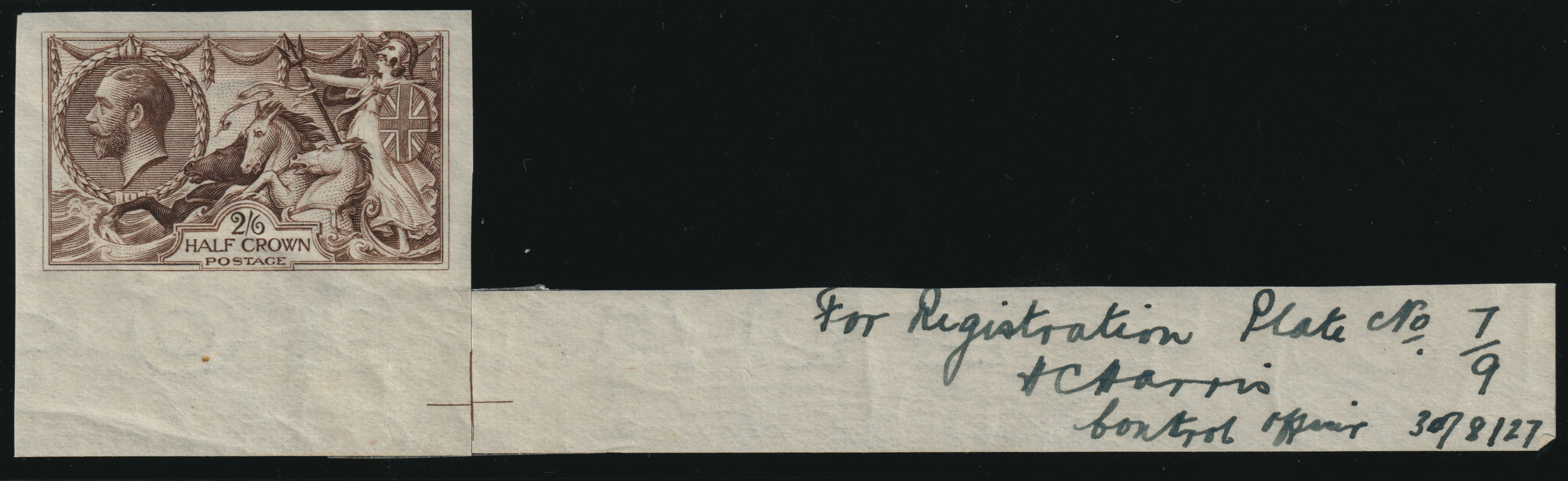 A very fine unused with original gum bottom marginal imperforate imprimatur with attached spur of additional sheet margin annotated "For Regristration Plate No 7/9, HC Harris, Control Officer 30/8/27".