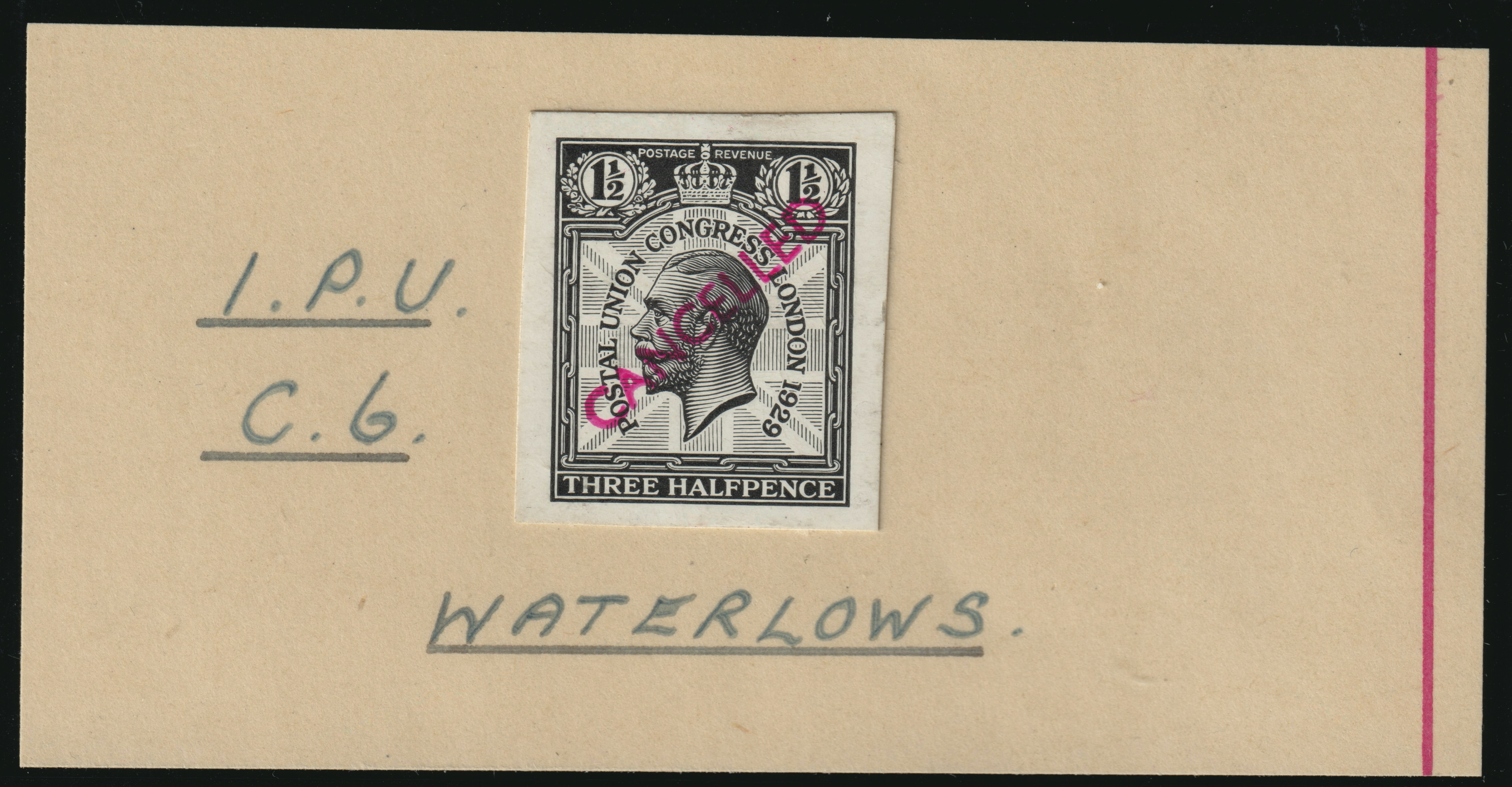 A very fine stamp size example printed in black on glazed card overprinted "CANCELLED" (19.5 x 2.5mm) in red, affixed to piece annotated "I.P.U./C.6./Waterlows".