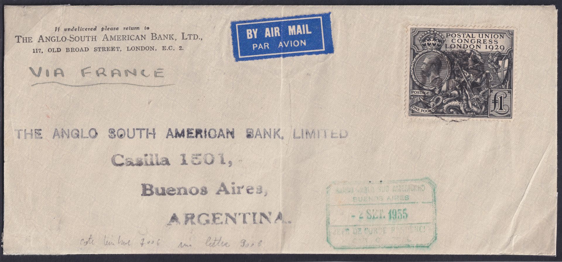 A very fine commercially used example on a flown cover from London to Buenos Aires neatly tied by a London rubber Air Mail datestamp with a green Merchants cachet below applied on arrival for 'SP.2.1935'.