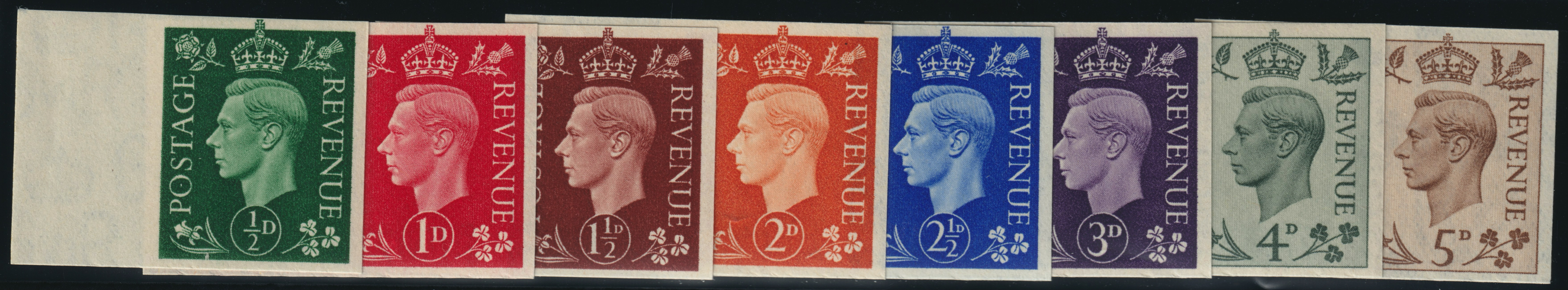 A very fine set of four imperforate essays depicting the King in the uniform of the Welsh Guards (Design Type D). Printed in green, red, brown and blue on gummed E8R (sideways) watermarked paper, each mounted on thin card as originally presented to