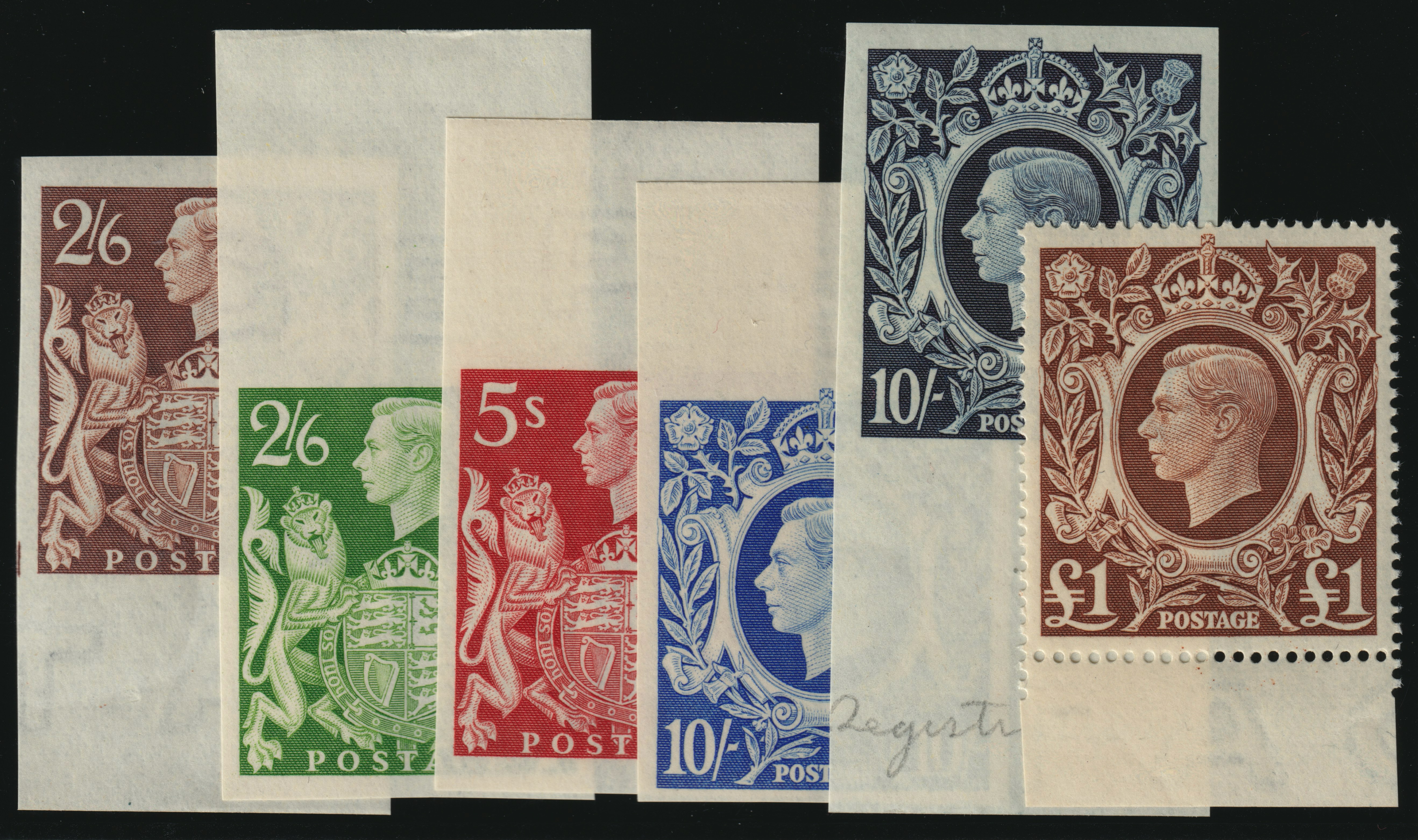 Very fine unmounted mint with full original gum set of six imperforate (£1 Brown Perforated) marginal imprimaturs, each with a “BPMA" handstamp on reverse.