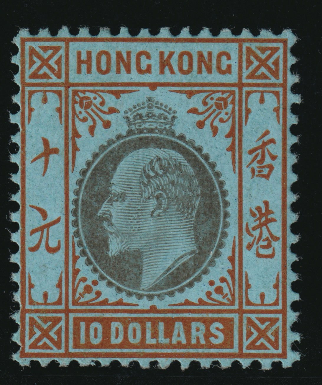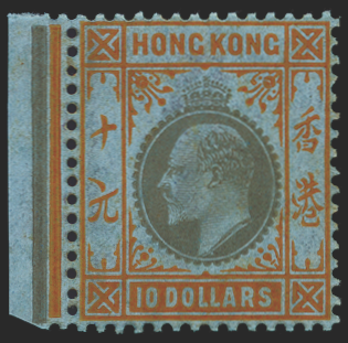 Hong Kong 1904-06 $10 slate and orange/blue, watermark MCA, chalk-surfaced paper, reduced margin at left, SG90b.