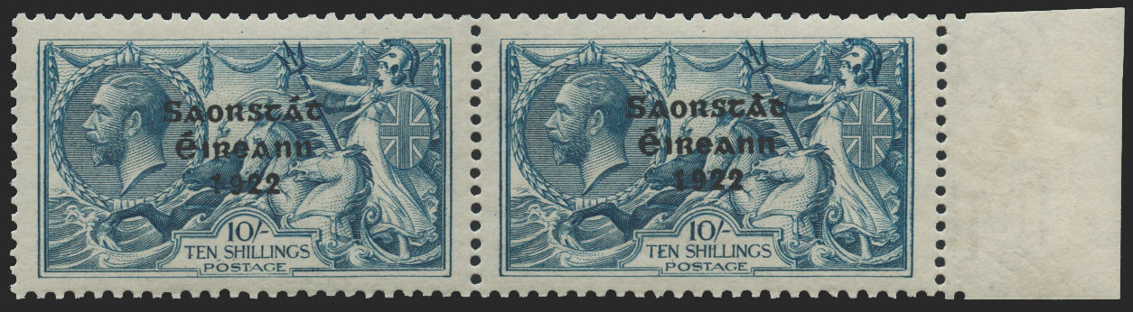Ireland 1922-23 10s dull grey-blue "Seahorse", type 5 Thom overprint in blue-black, right marginal horizontal pair, right stamp (R7/4) showing variety 'Accent reversed', SG66b.