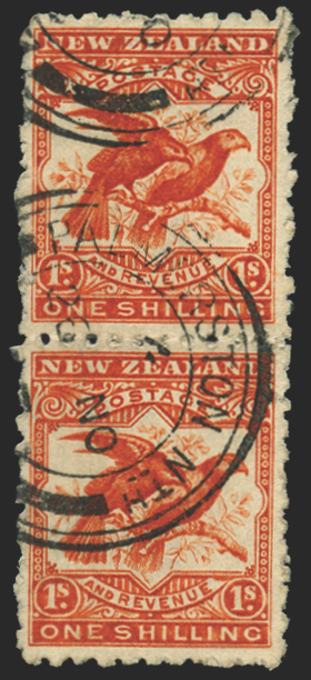 New Zealand 1902-07 1s orange-red "Kea and Kaka" ERROR WATERMARK 12b (INVERTED), vertical pair neatly cancelled Palmerston North circular date stamps, SG315ba.