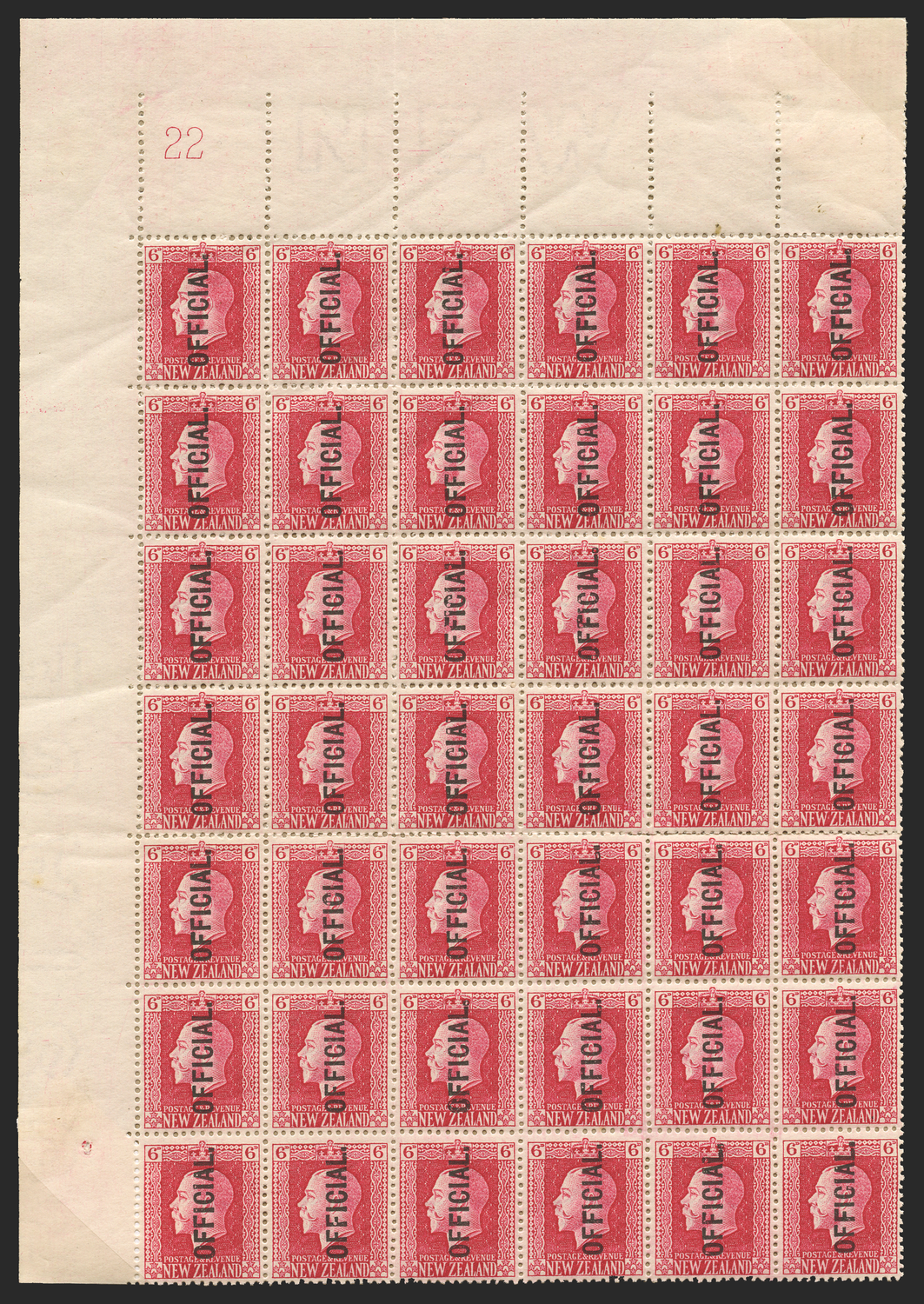 New Zealand 1915-27 6d carmine Official, upper left corner block of 42 (6x7) with plate number '22', the top four rows perforations 14x13½, the bottom three rows perforations 14x14½, giving six vertical 'two perforation' pairs at rows 4-5.