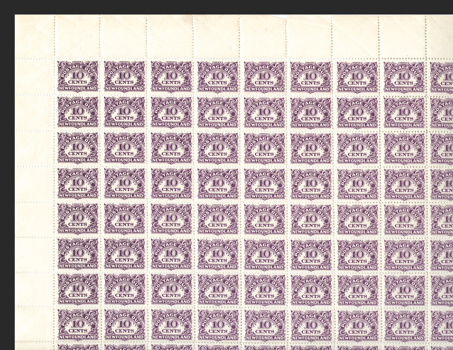 Newfoundland 1939-49 10c violet Postage Due, perforations 11, watermark 106, complete sheet of 100 (10x10), showing variety 'LUE' for 'DUE' (R 3/3 and 3/8), SGD6a/ac.