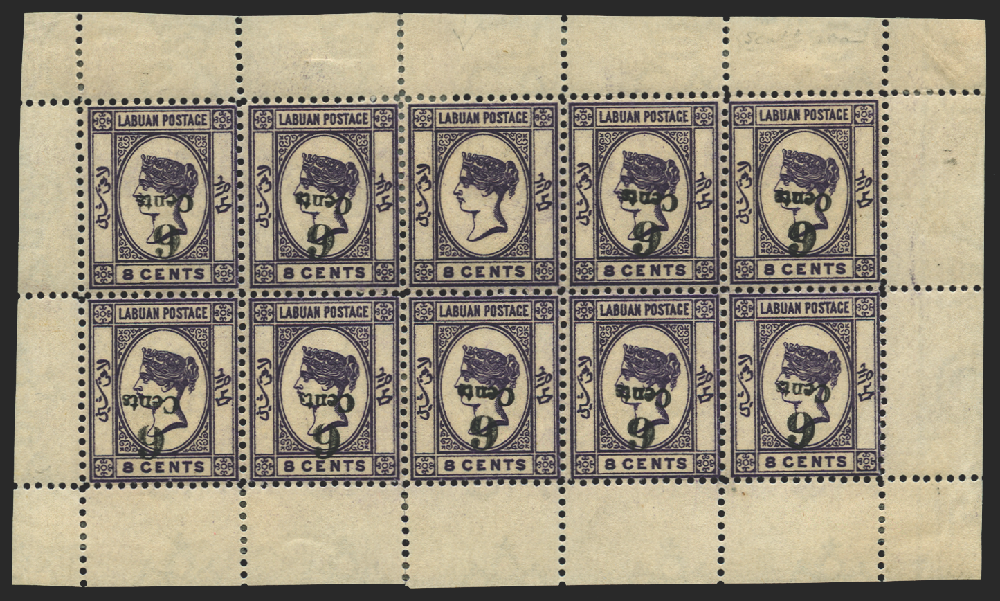 North Borneo Labuan 1891-92 6c on 8c deep violet, type 10 surcharge with 2mm space, complete sheet of 10 (5x2) with pantograph variety "No dot at lower left" at R2/5, all showing ERROR SURCHARGE INVERTED, except R1/3 showing SURCHARGE OMITTED, SG34a,f.