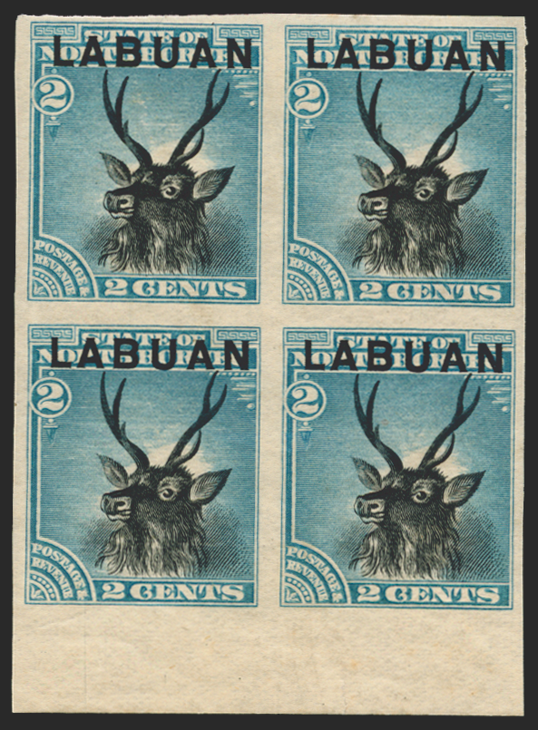 North Borneo Labuan 1894-96 2c blue 'Sambar stag', IMPERFORATE block of 4 from foot of sheet, SG63a.
