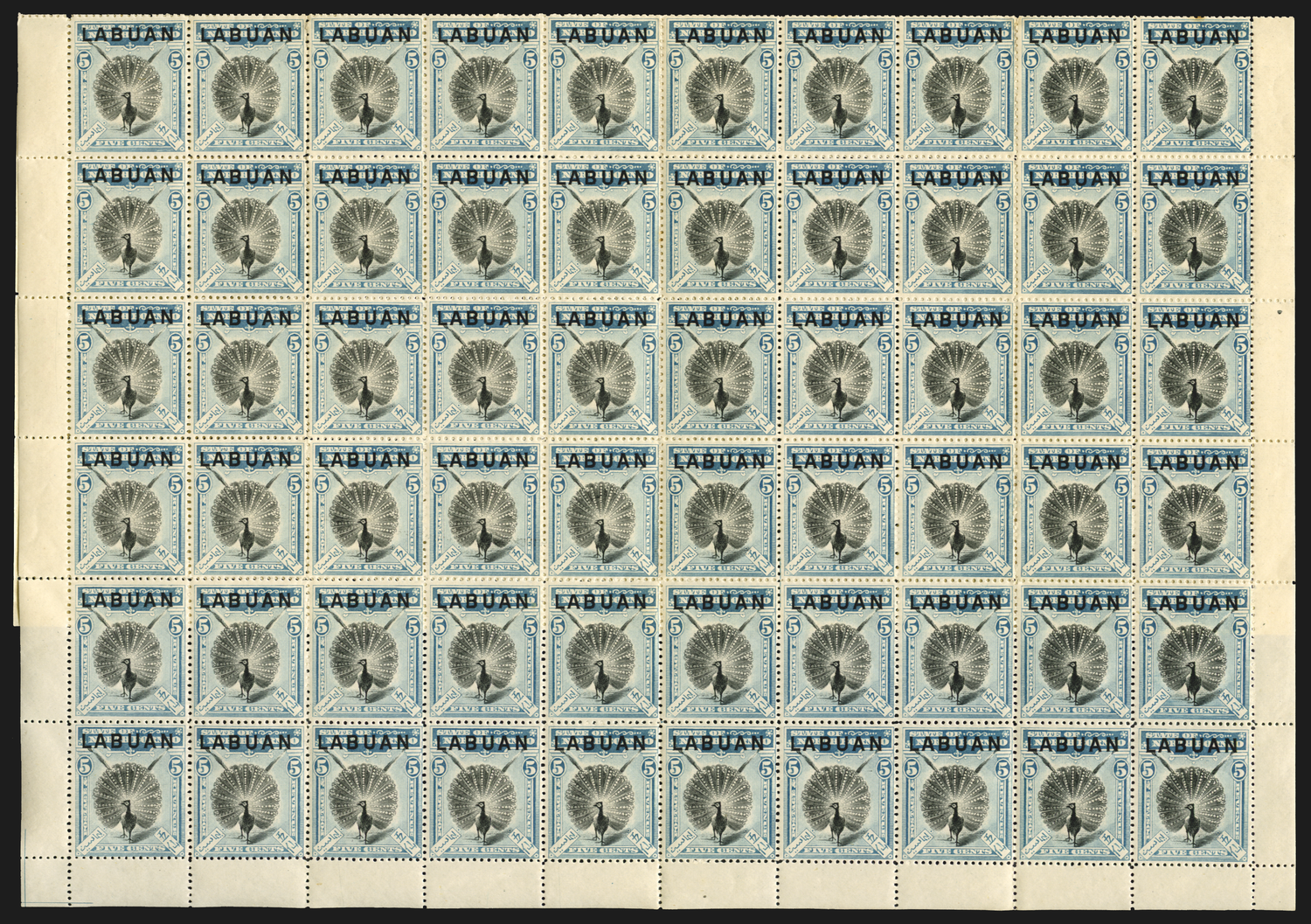 North Borneo Labuan 1900-02 5c black and pale blue "Argus Pheasant", perforations 13½-14, complete folded sheet of 100 (10x10) with sheet number '10', SG114.