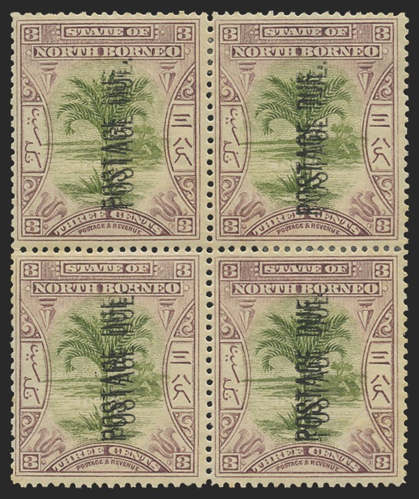 North Borneo 1901-02 3c green and dull mauve Postage Due, type D1 local overprint with stop after "DUE", perforations 14½-15, ERROR OVERPRINT DOUBLE, block of 4, SGD27a.