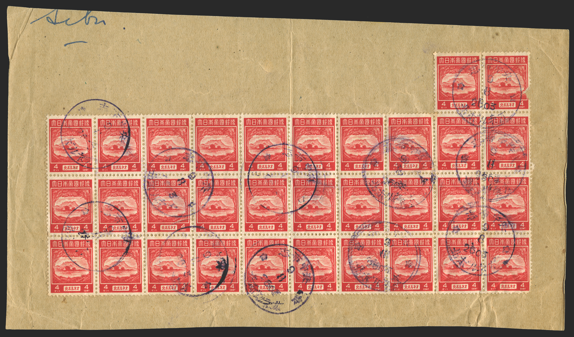 North Borneo Japanese Occupation 1943 (29 Apr) 4c red, type 2, BLOCK OF THIRTY-TWO (10x3, with an extra pair at upper right), tied to large piece by eleven good to fine strikes of SIBU (Sarawak) type JD3 circular date stamps in violet, dated "9 8 2603" (= 9 Aug 1943), SGJ18.