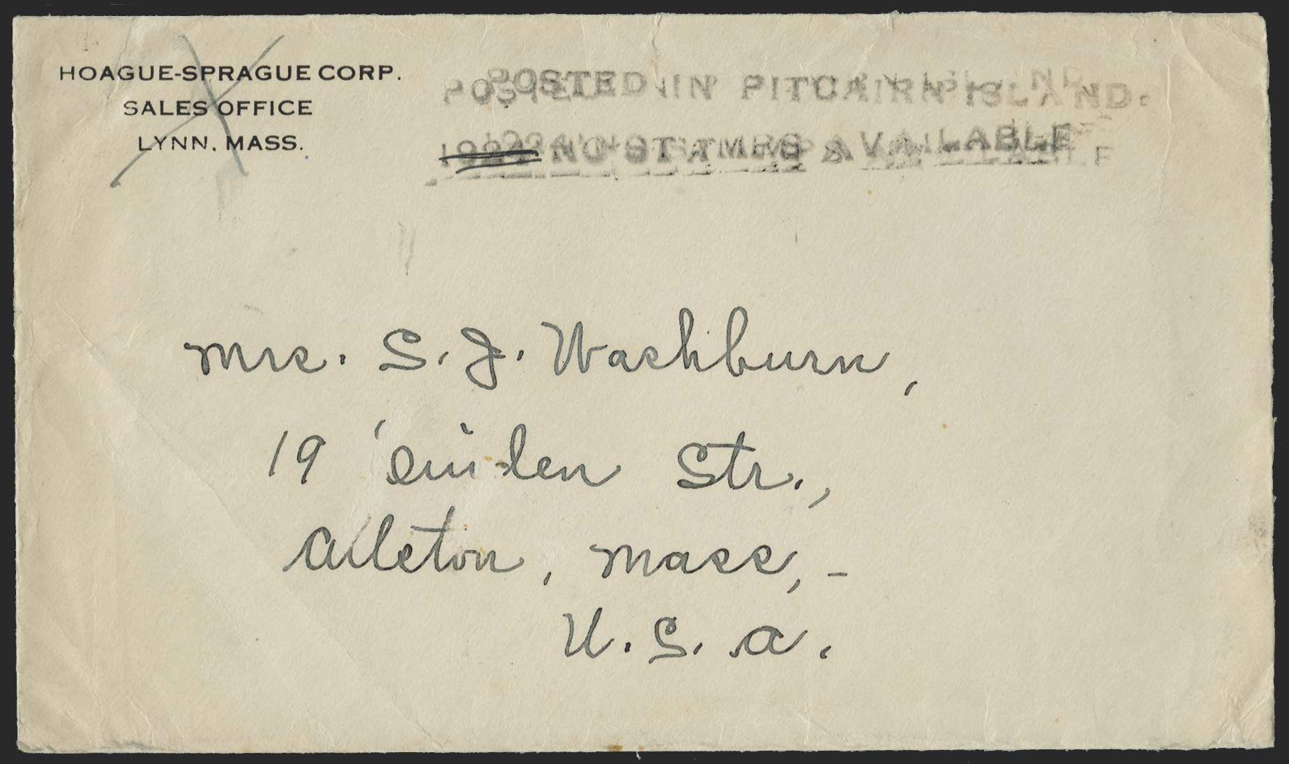 Pitcairn Islands 1925 stampless cover to Alleton, Mass., U.S.A., Washburn correspondence, with fine (slightly doubled) 'POSTED IN PITCAIRN ISLAND/1924 NO STAMPS AVAILABLE' large cachet in black (as type IV), with the year deleted in black M/S, SGC9.