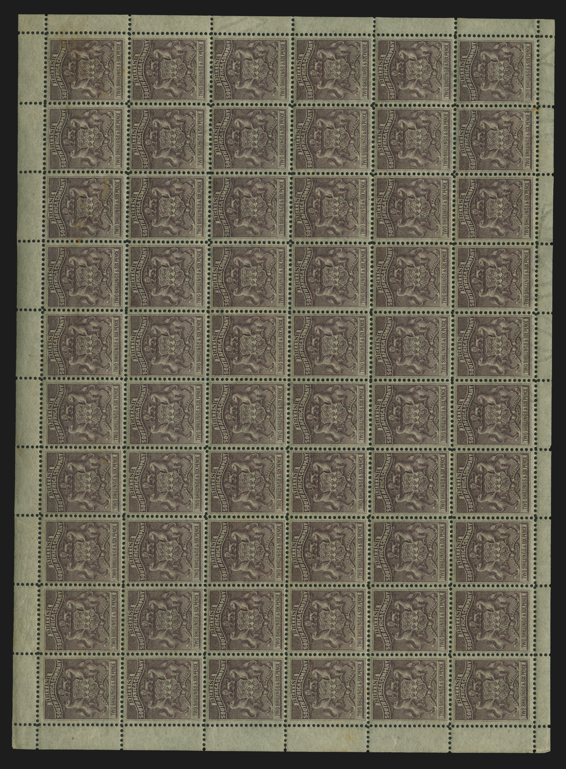 A fine unmounted mint complete sheet with full original gum. Some imperfections, as to be expected for a sheet of this size, with a portion of the right margin missing, gum tones and vertical crease through row 18). Most stamps are very fine and fresh.