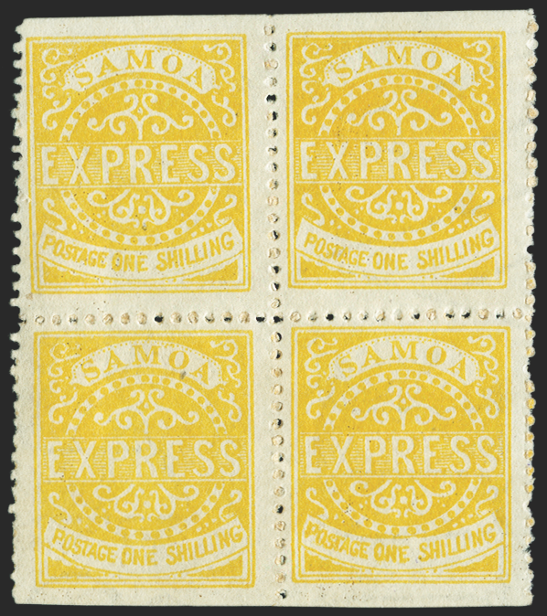 Samoa 1877-80 'EXPRESS' 1s dull yellow, 2nd state, perforations 12½, block of 4 from R1-2/2-3 on the sheet, SG7.