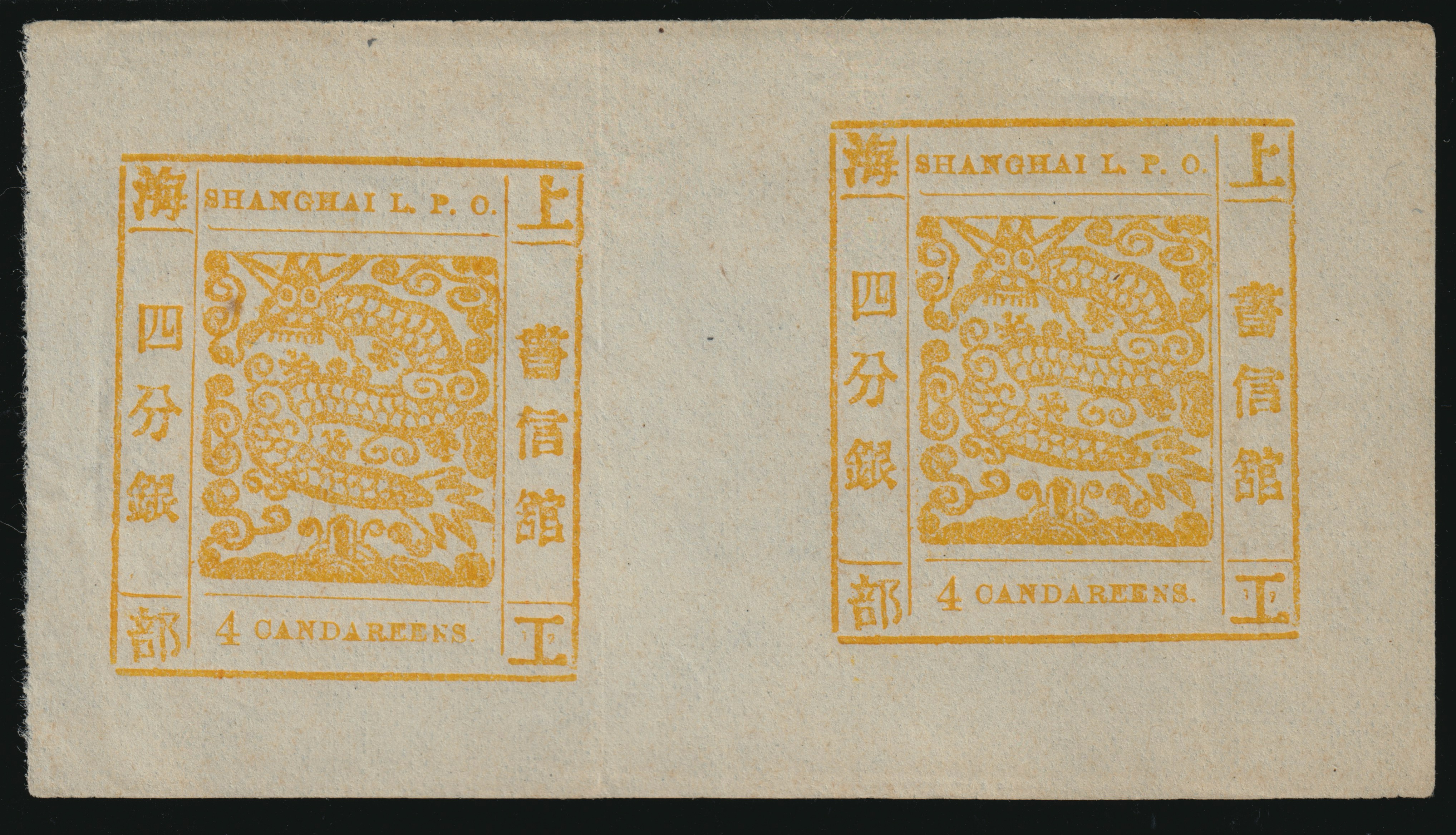 China 1866 (Shanghai) 4ca yellow Candareens in the plural, modern numerals on wove