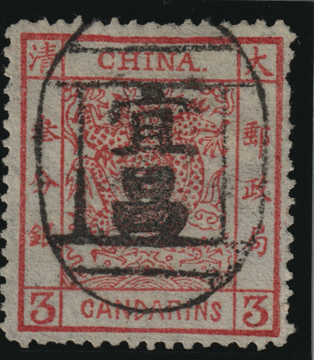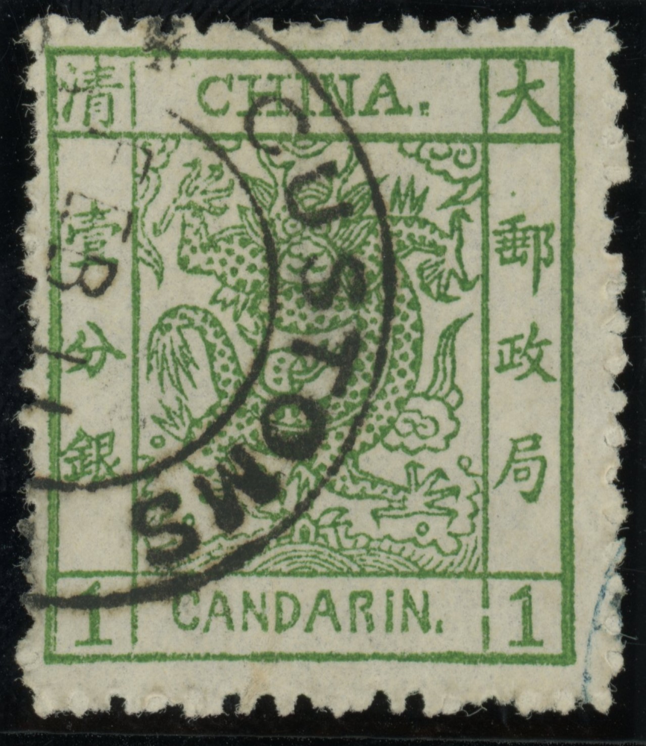 A very rare postal cancellation on the Large Dragons first stamp issues of the Chinese Empire.