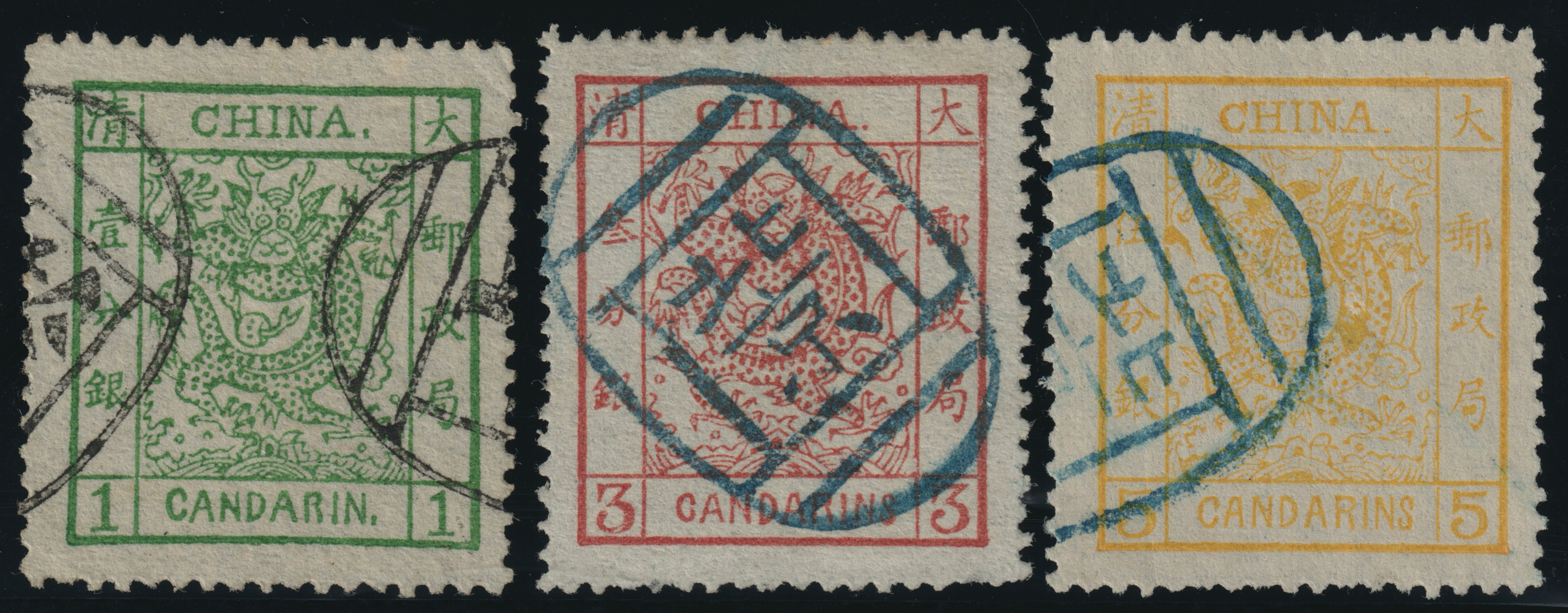 An attractive trio of early Imperial China Large Dragon issues, printed on delicate thin pelure paper with 4½mm spacing. This scarce group includes: