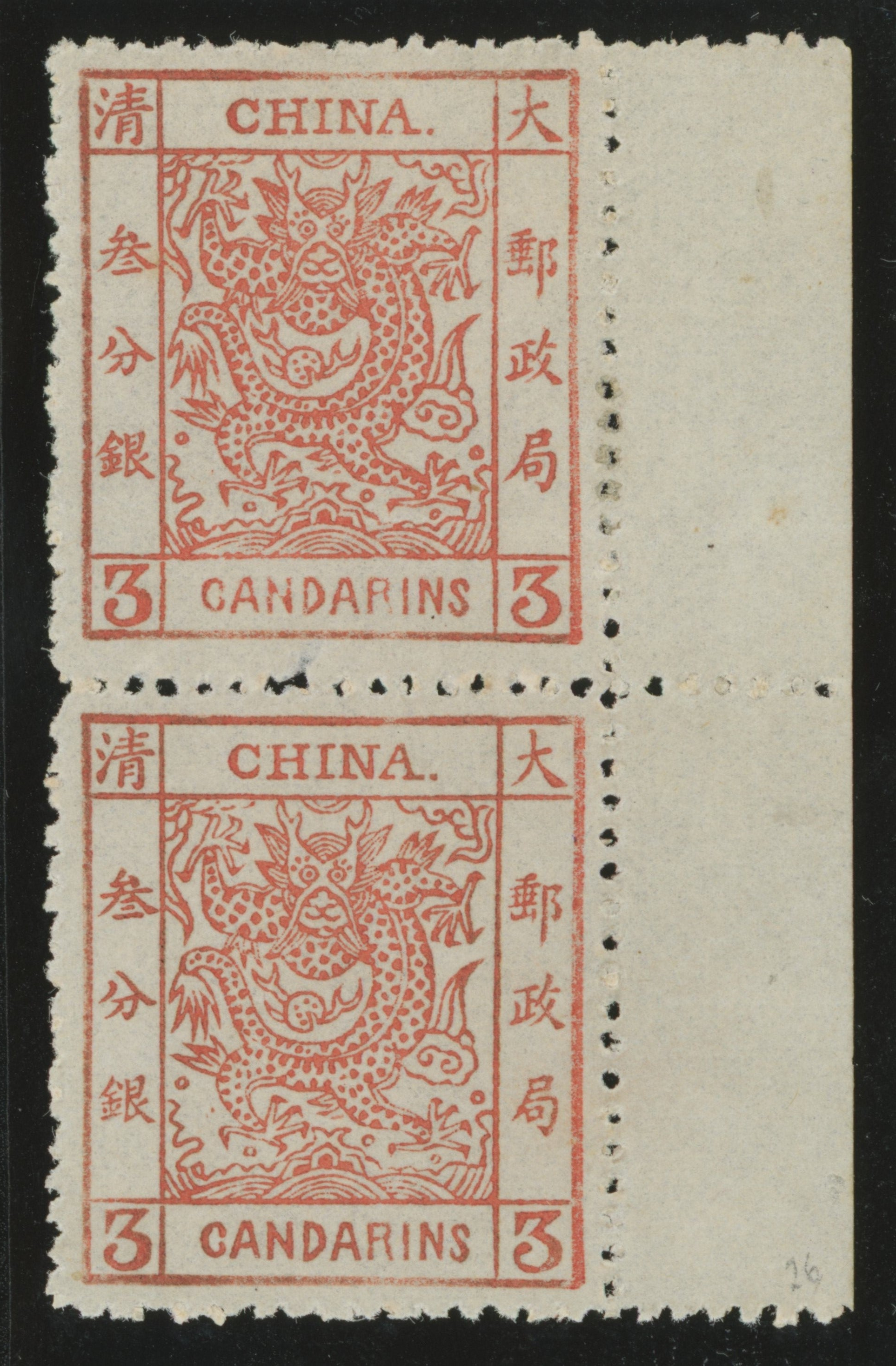 China 1883 3ca vermilion on thicker paper, 2½mm spacing, rough perforations,