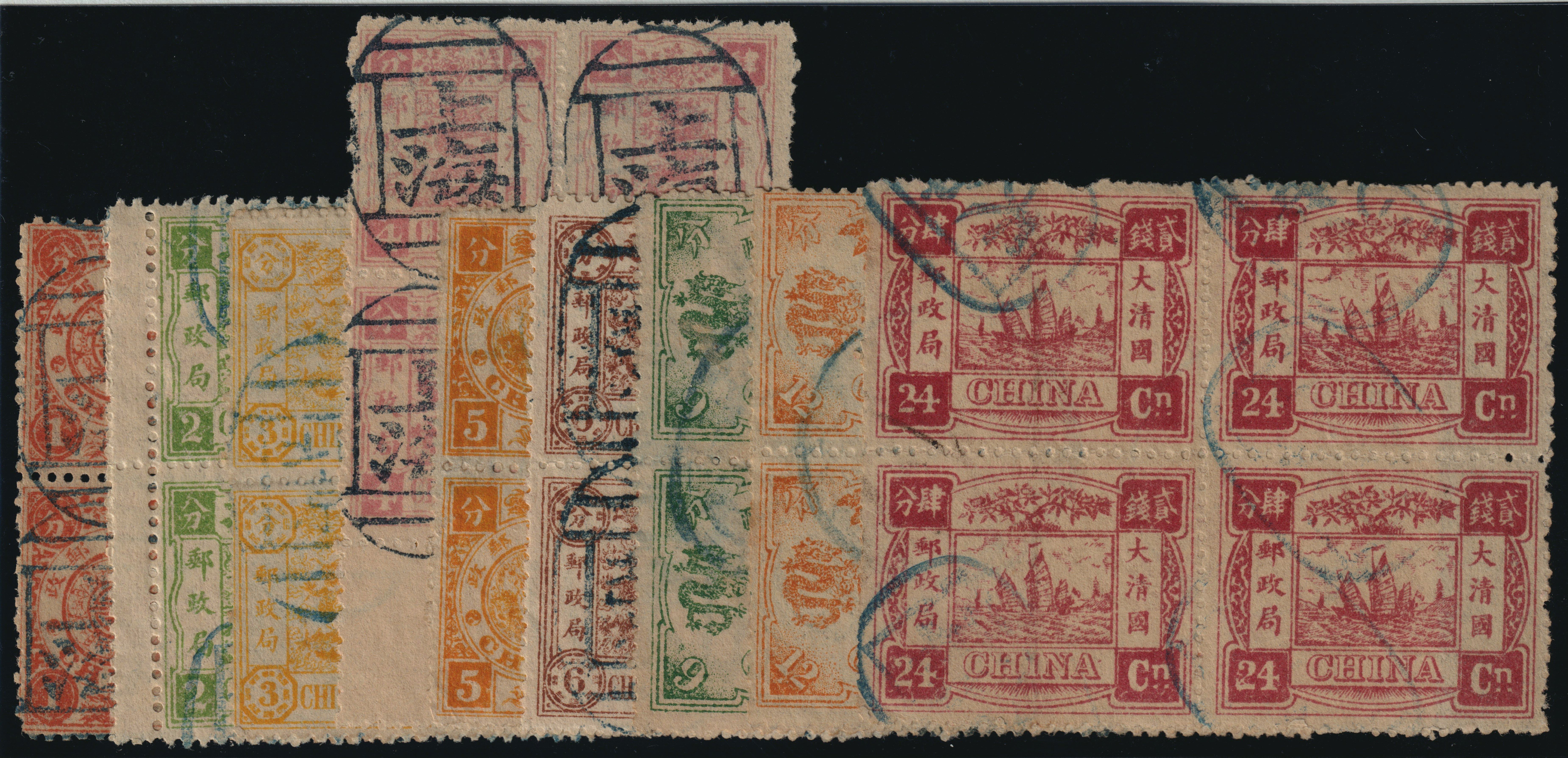 The 12ca was used by two Customs circular date stamps, and the others by seal cancels from Peking, Shanghai or Tientsin.