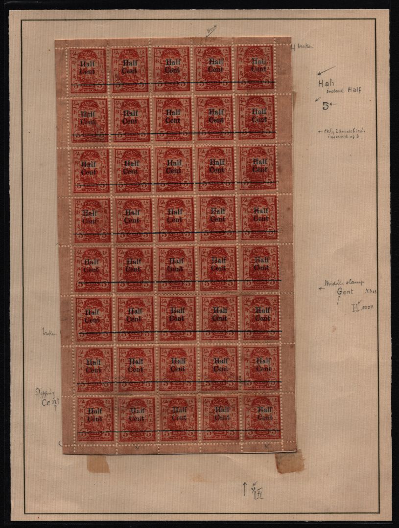A reconstructed sheet of 40 including ‘Gent’ for 'Cent' variety in position 23. There are also several other minor printing varieties. Affixed to piece of card by margins. Some perforation separations including along the centre of sheet expected