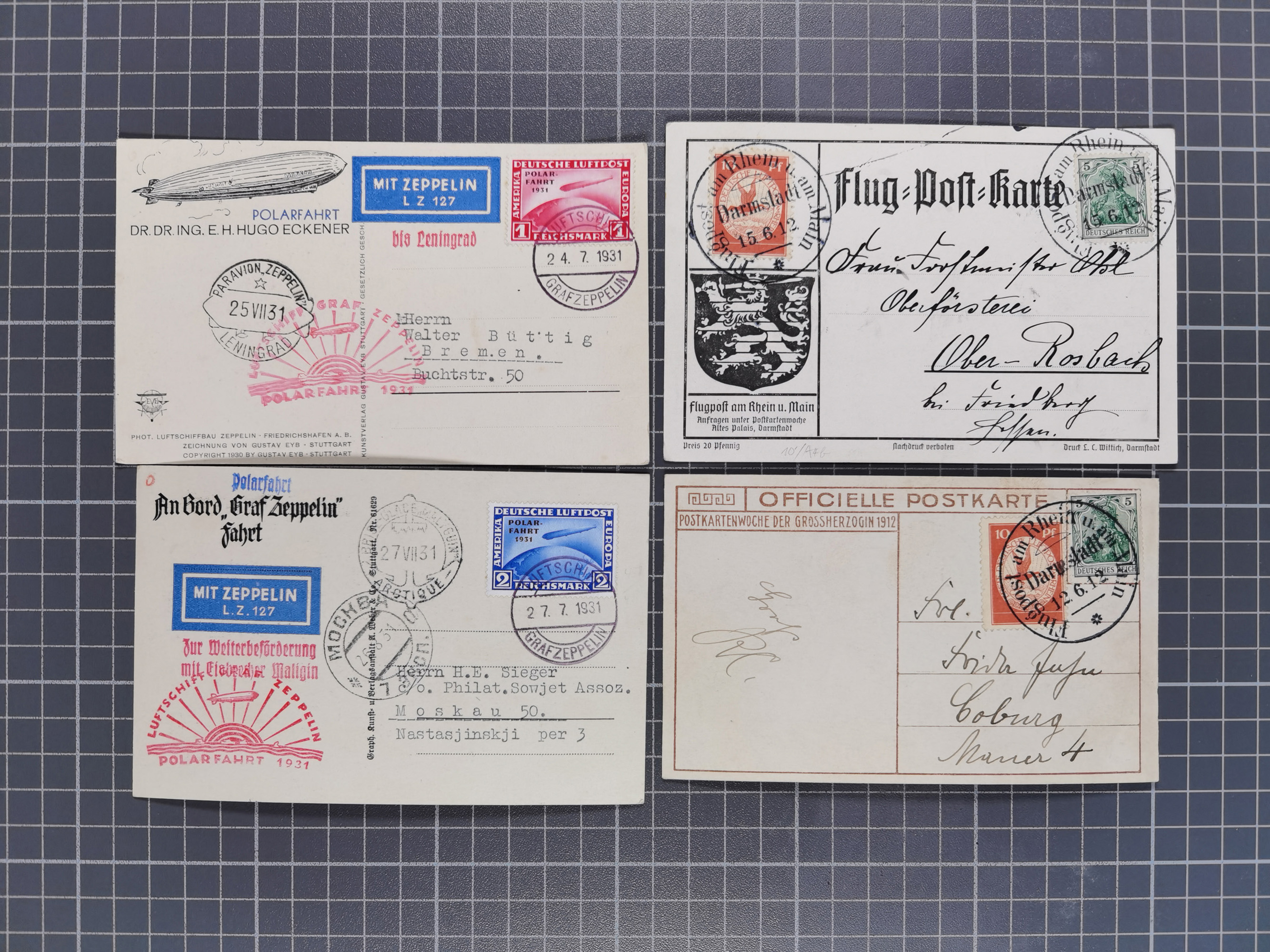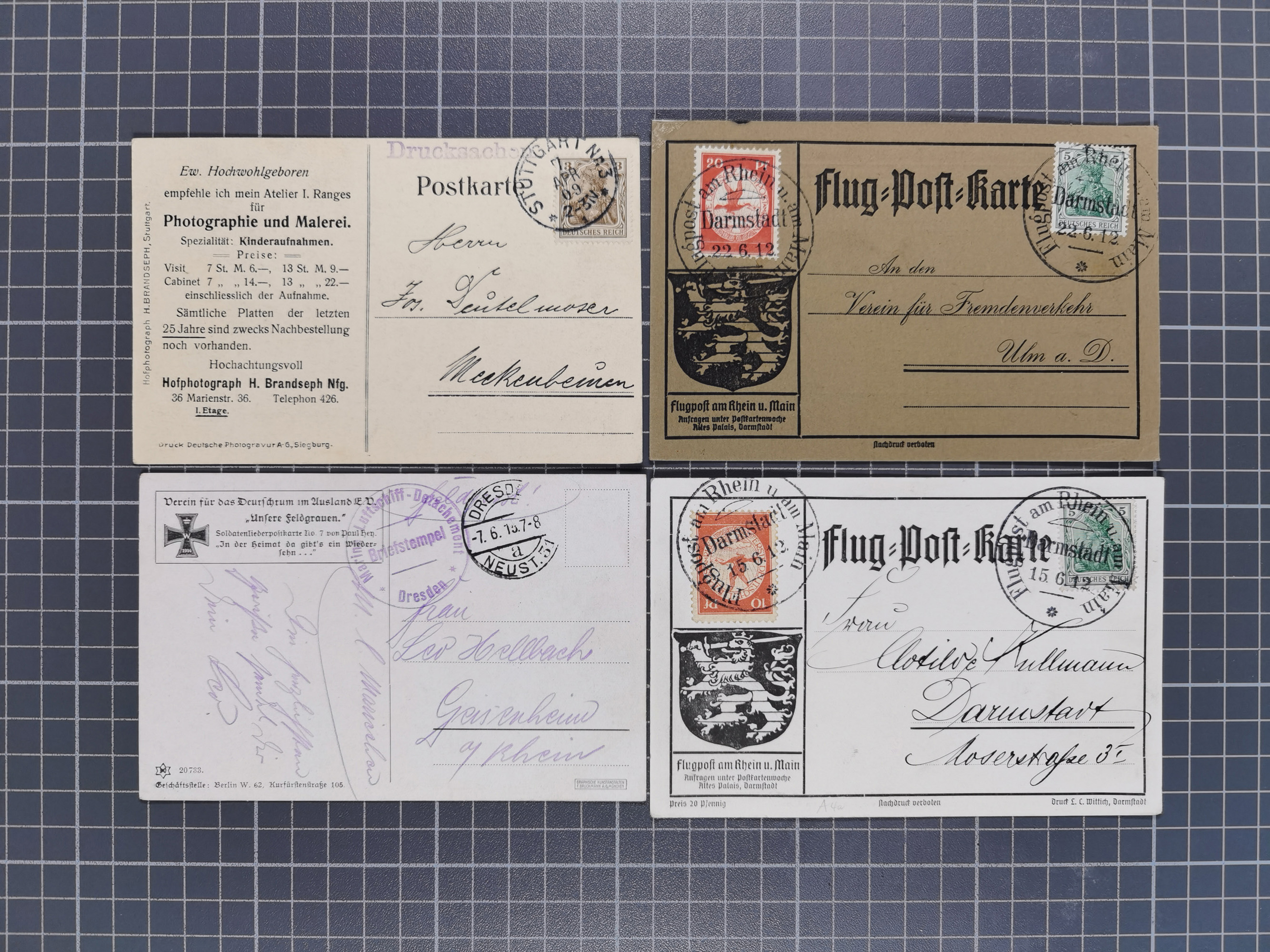 Rhein/Main: 1912, Gelber Hund 1 M., drei Einzelwerte und Germania 5 Pfg. je mit Flugstempel "Darmstadt 22.6.12” auf sogenannter "Roter Hund”-Karte. Die Karte oben mit kleinen Randbügen, ansonsten in einwandfreier Erhaltung (Sieger 13b)